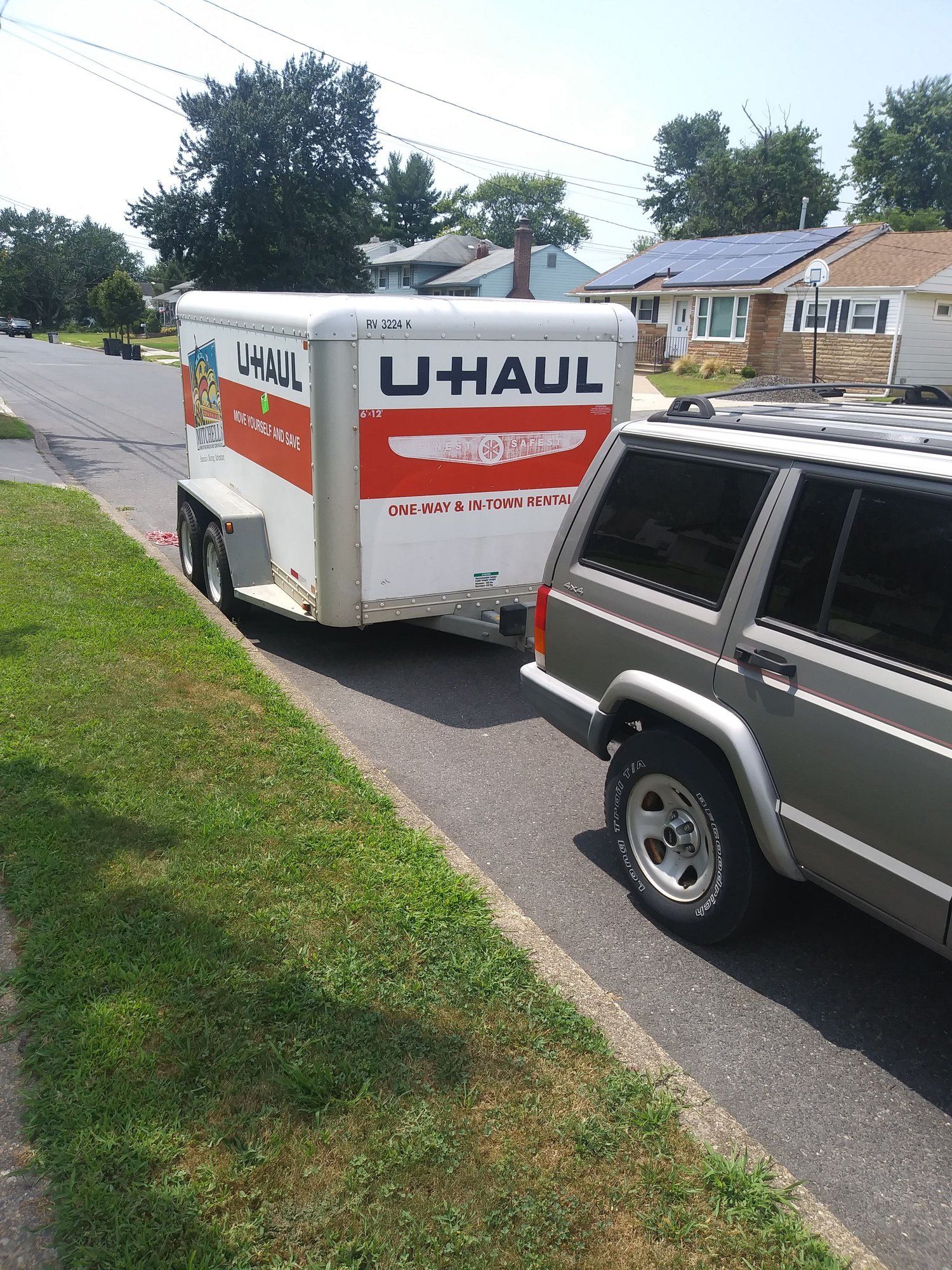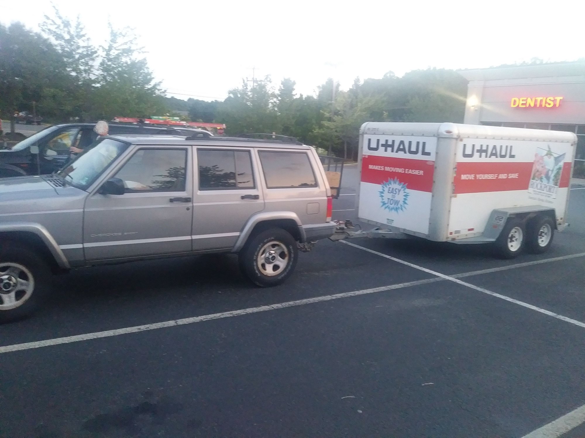 Here's a shot of it towing the U-haul trailer, somewhere near DC I think. It made the rear sag some, but not too bad. It would have never done it without the new leaf springs. The only time it was iffy was hard braking and when the trailer was empty it sways like crazy above 65 mph. Fully loaded you can do 70-75 if it's not too windy. Also tell me how my XJ gets 17 mpg normal driving, and I got 16 mpg with the loaded trailer and no AC running. With AC it went down to ~13 mpg.