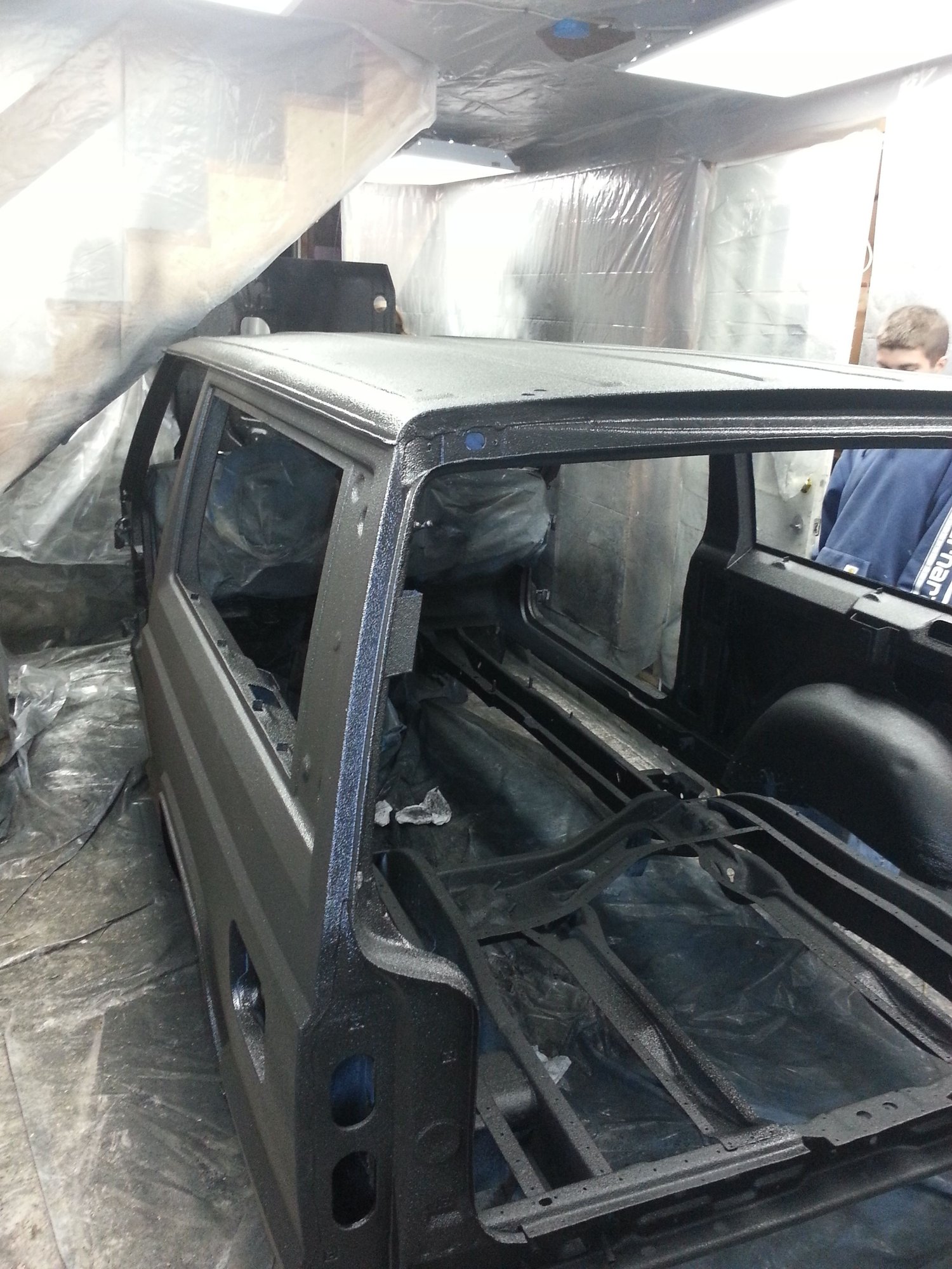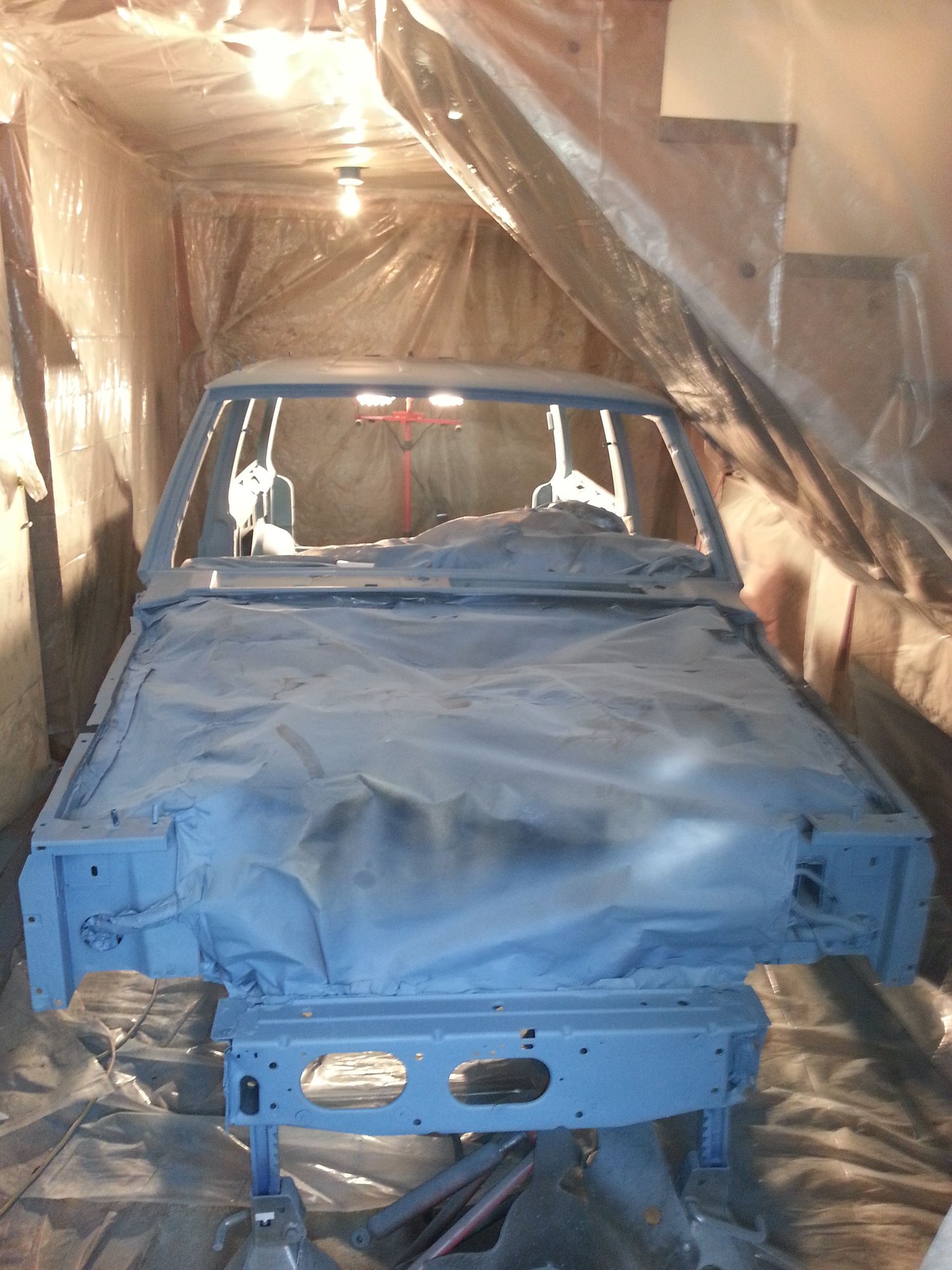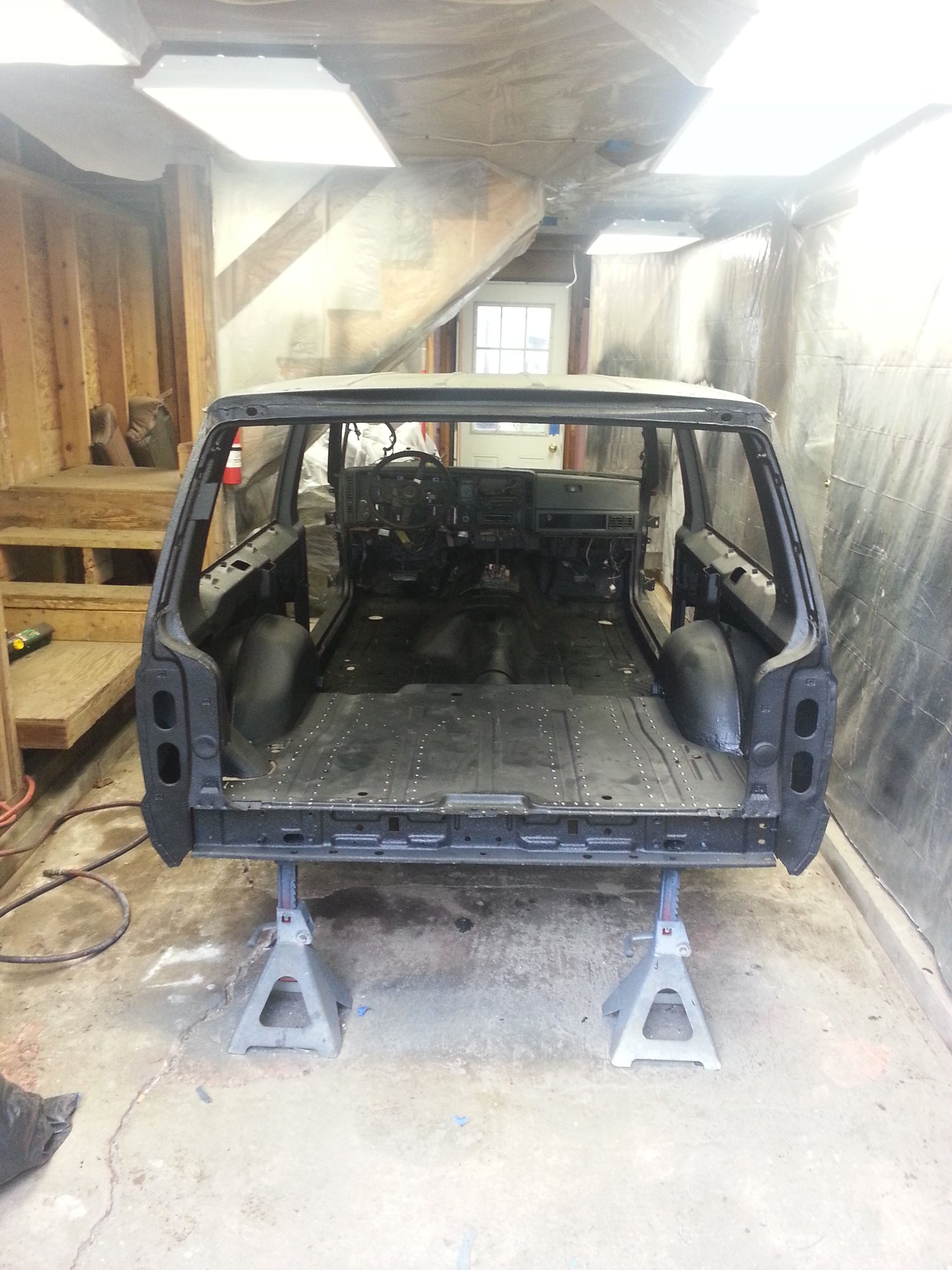 At this point a couple good friends helped me out a lot. One offered to let me use his automotive shop compressor to run a rented media blaster. The other offered his garage to let me get some paint on it.