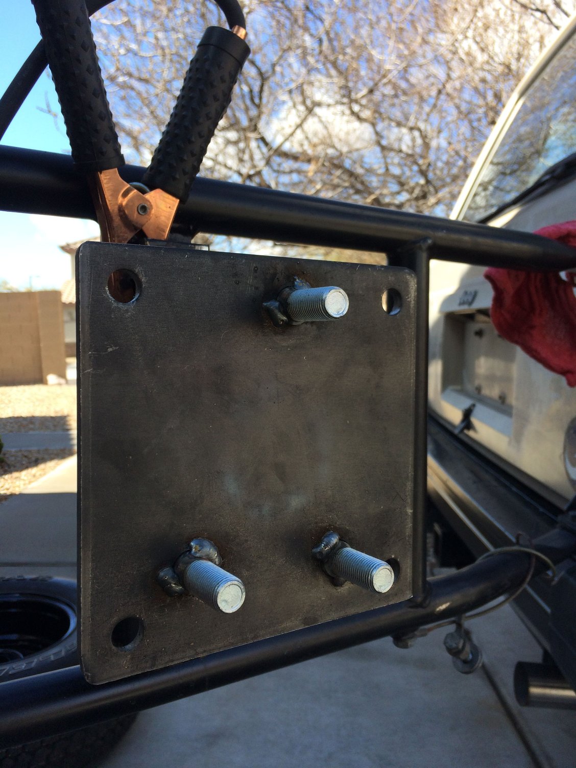 Did some more work on the Cherokee today. I ordered a matching spare so I needed to redesign the tire carrier so I started there. I cut the extension off and add a plate with 3 studs drilled and welded to it.
