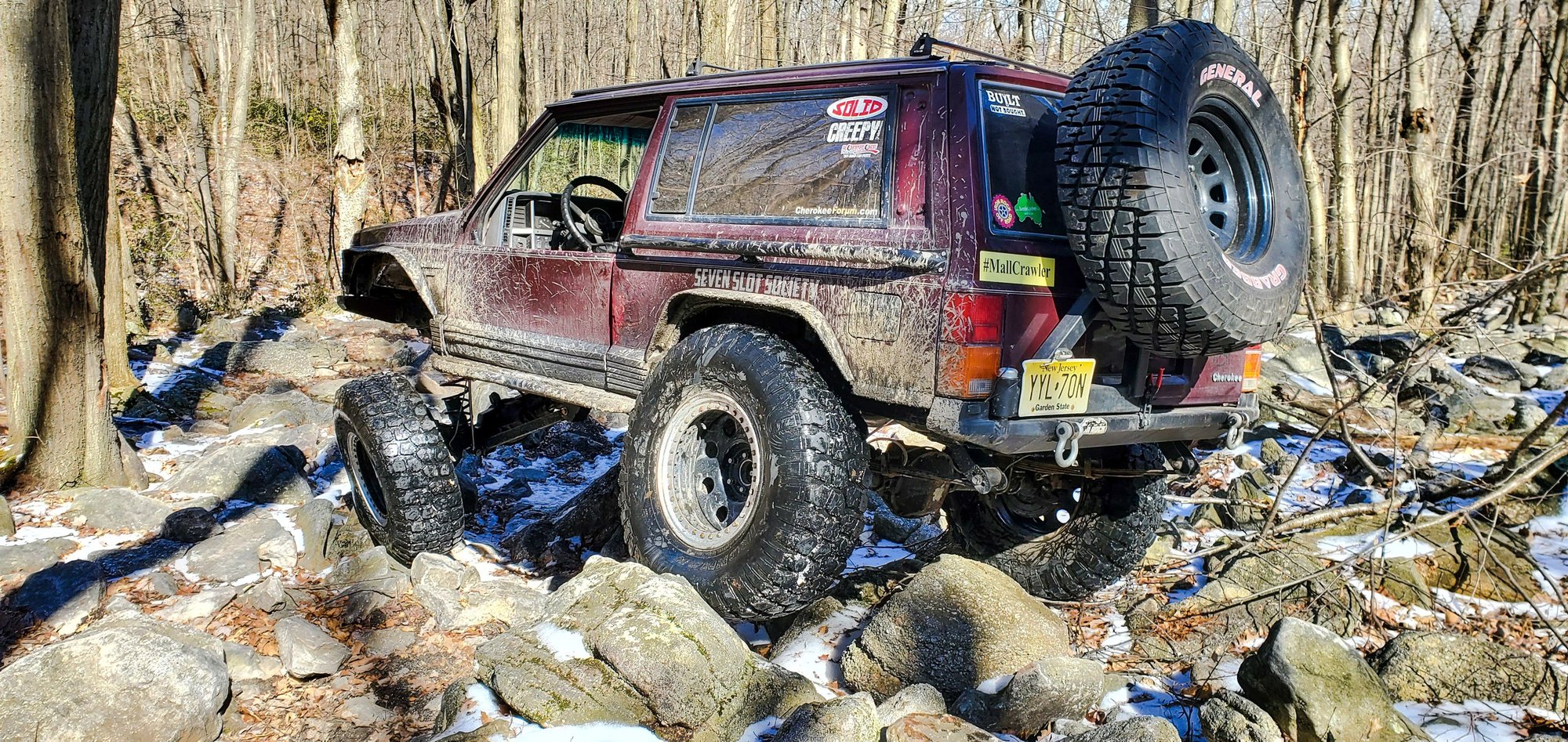 Took the jeep out with some friends the other day and made quick working finding out 5-6psi was a nice spot for the ice/snow in the trails. I ended the day by splitting the front driverside hardline at the brake fitting due to over flexing. Limit straps and a better bumpstop method up front are next. Fully flexed the stock bumpstop in the tower is only hitting the side of the 2-3rd hockey puck in the coil. I'm thinking on the frame for the lower links.