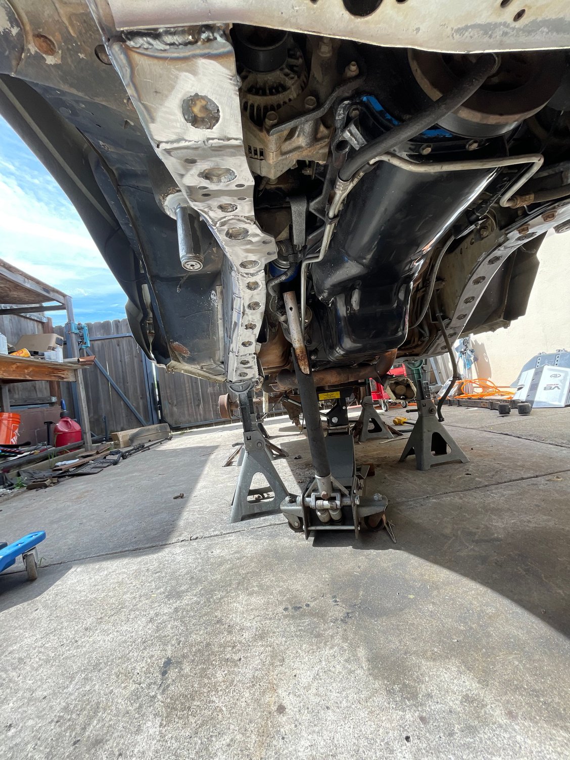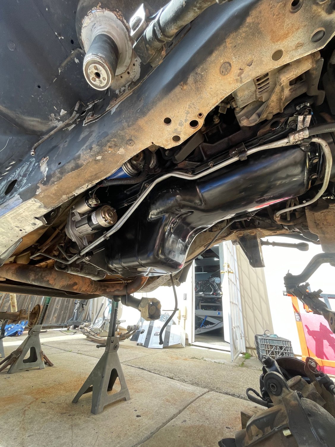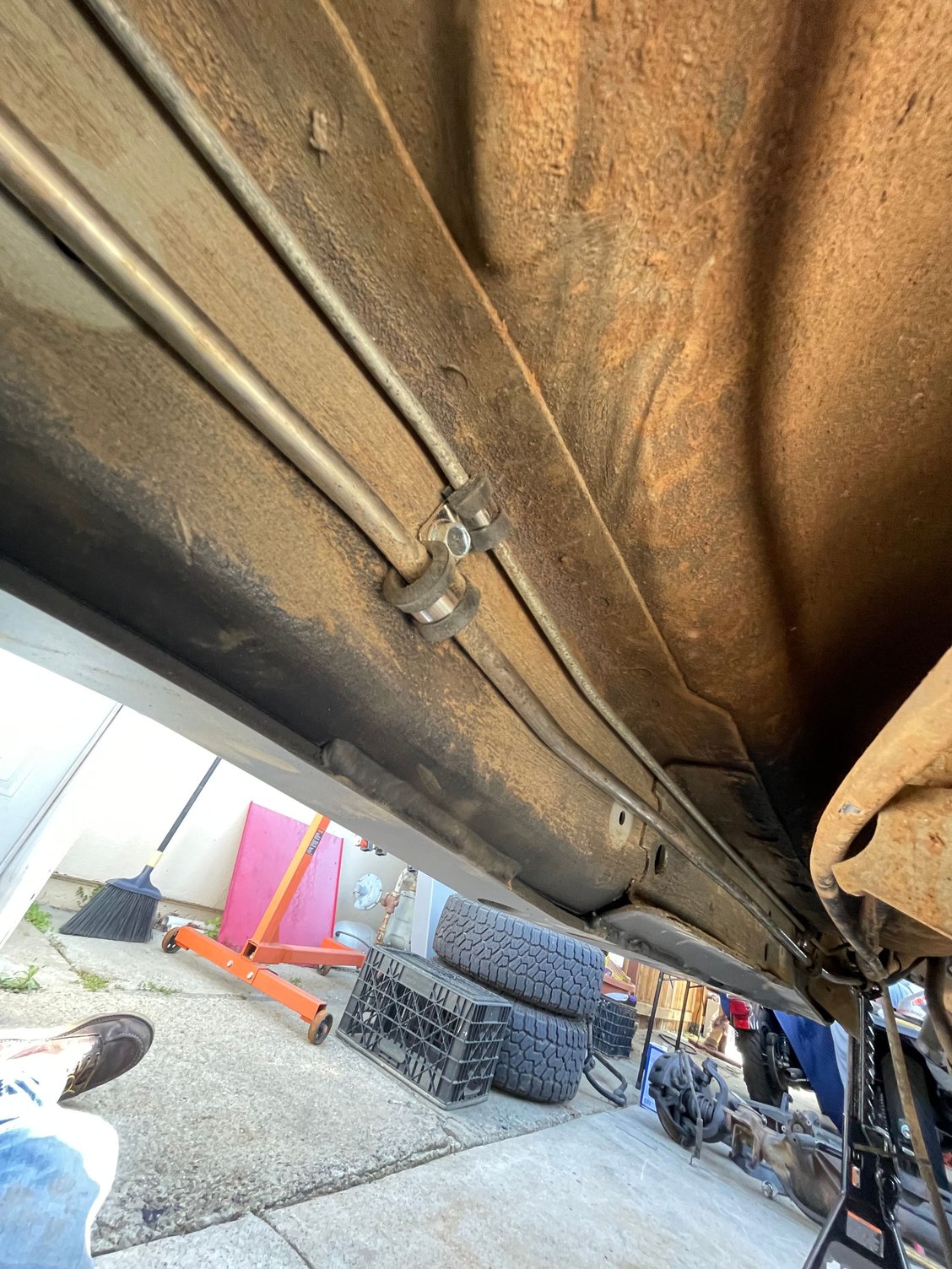 Relocated brake and fuel line with p clamps just slightly higher than factory position to clear the link bracket. Got the brackets fully bolted in and the trans crossmember. Still need to get the trans centered in chassis before I torque the trans mounts. The frame still needs some clearance work for the upper links. Very close to getting the front axle back in.