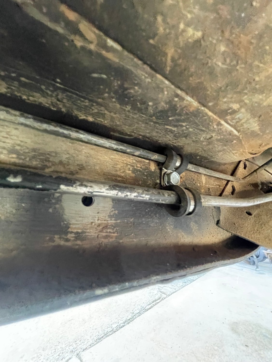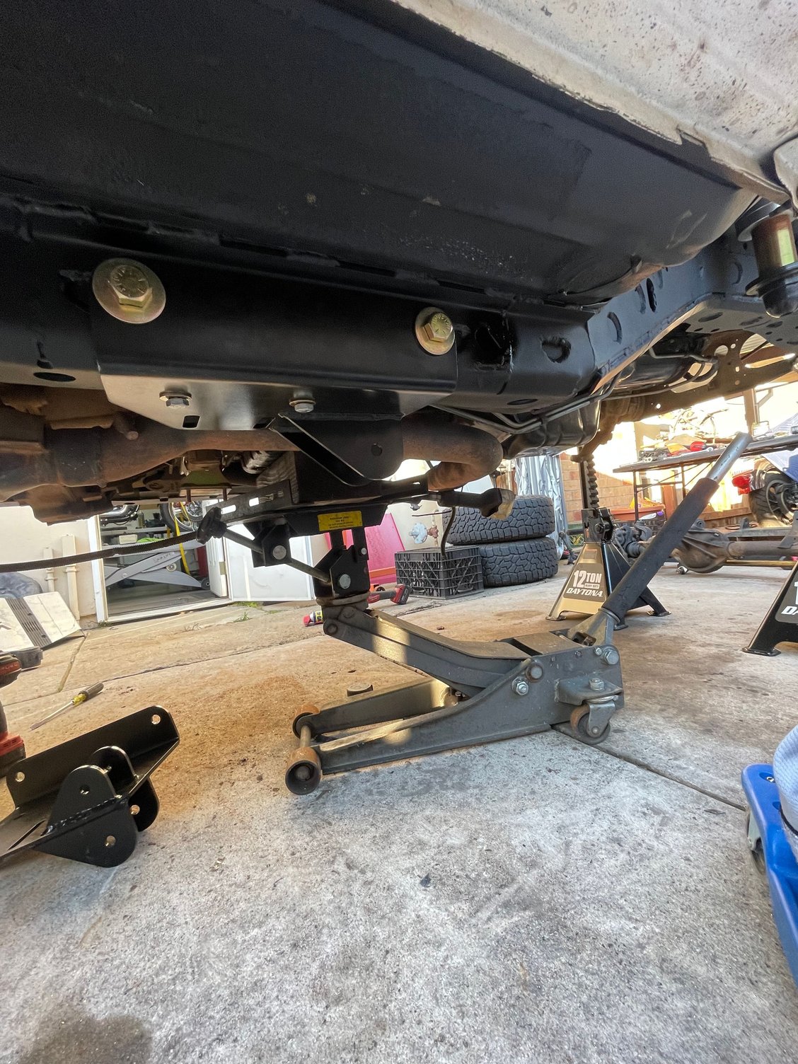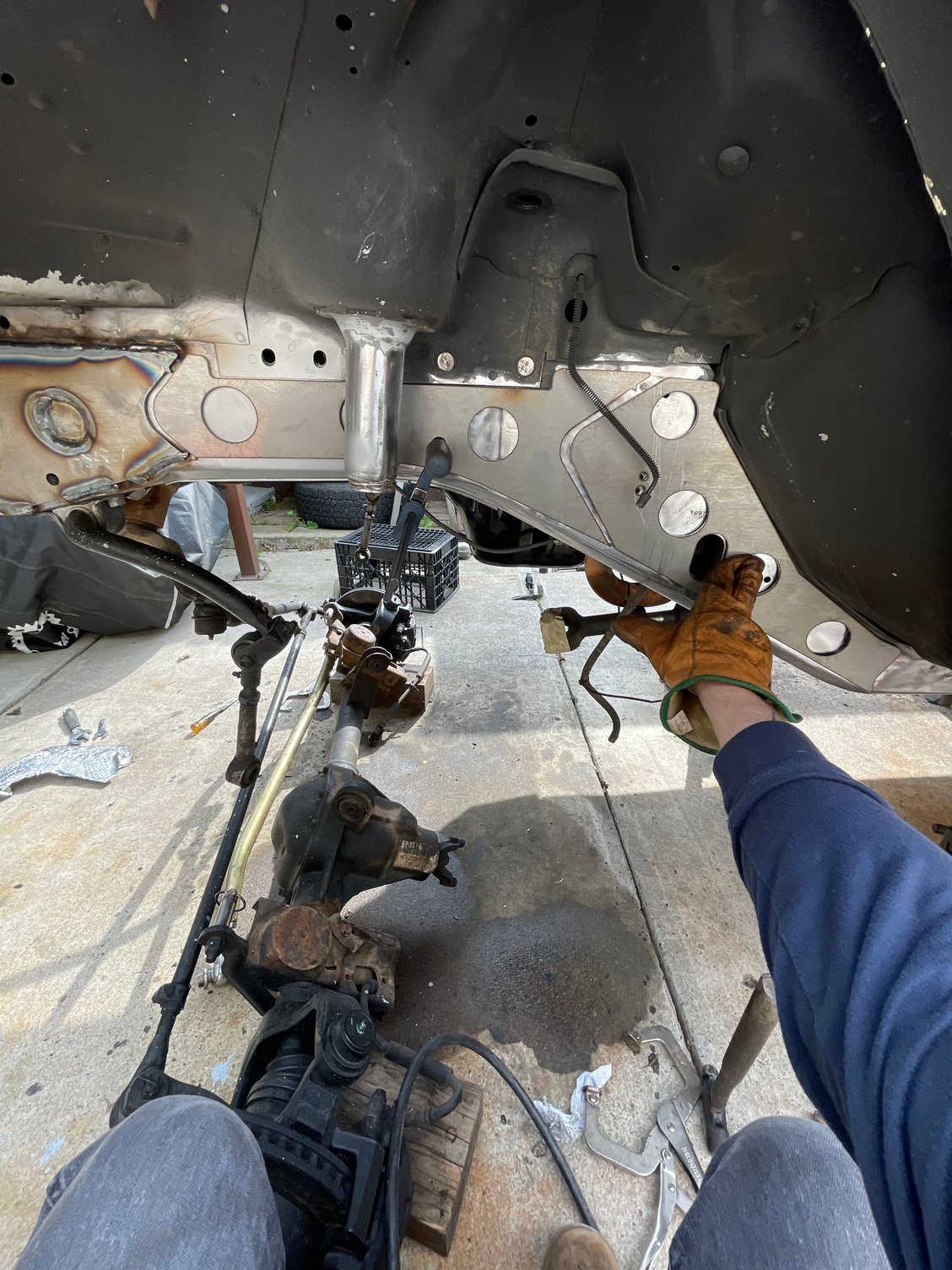 Relocated brake and fuel line with p clamps just slightly higher than factory position to clear the link bracket. Got the brackets fully bolted in and the trans crossmember. Still need to get the trans centered in chassis before I torque the trans mounts. The frame still needs some clearance work for the upper links. Very close to getting the front axle back in.