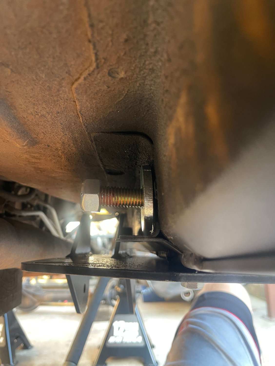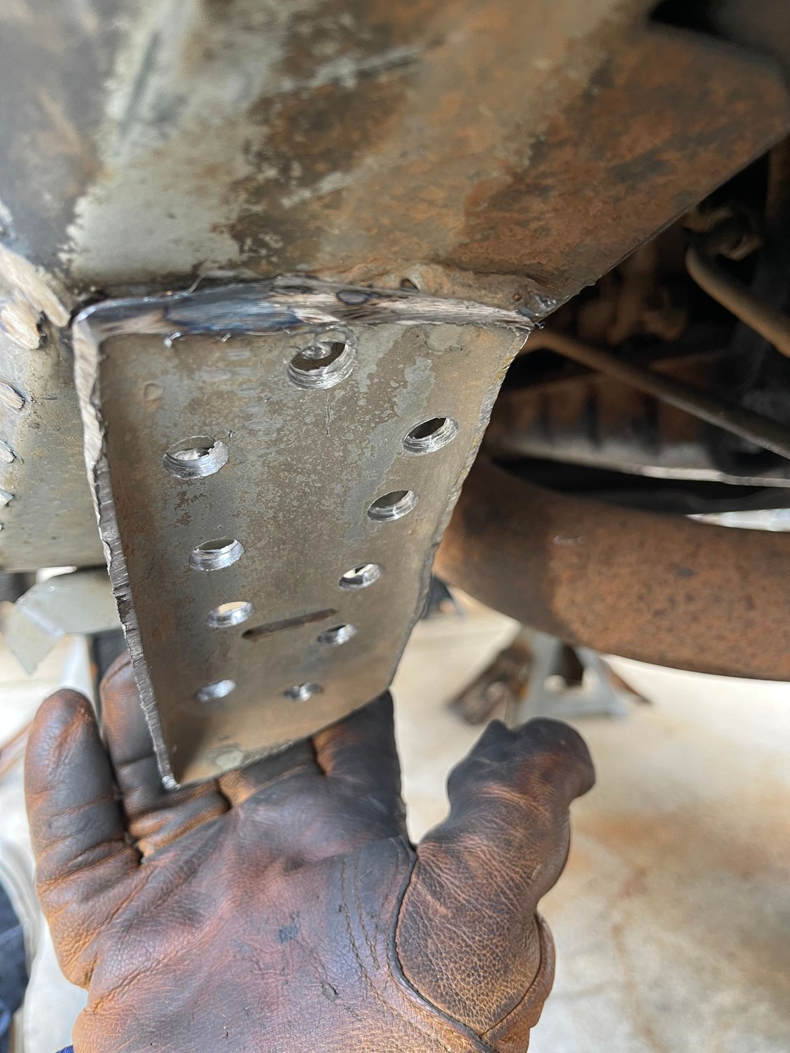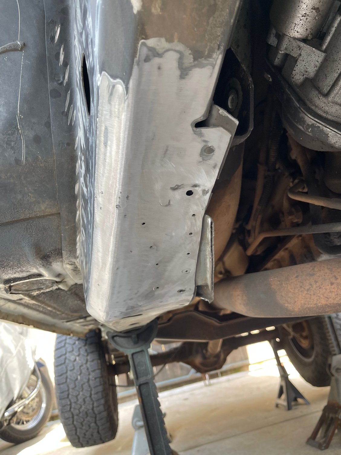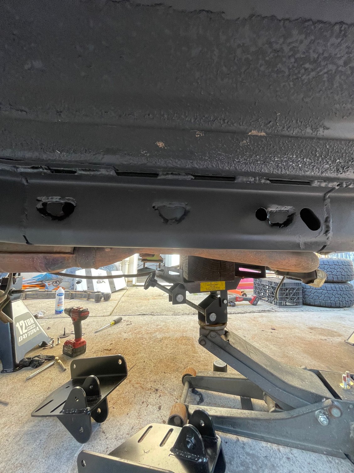 Drilled the holes to mount the the 4 link brackets. Got the passenger bracket mounted. Need to relocate my brake and fuel line before I can mount the driver side bracket. Stinkyfab trans mount