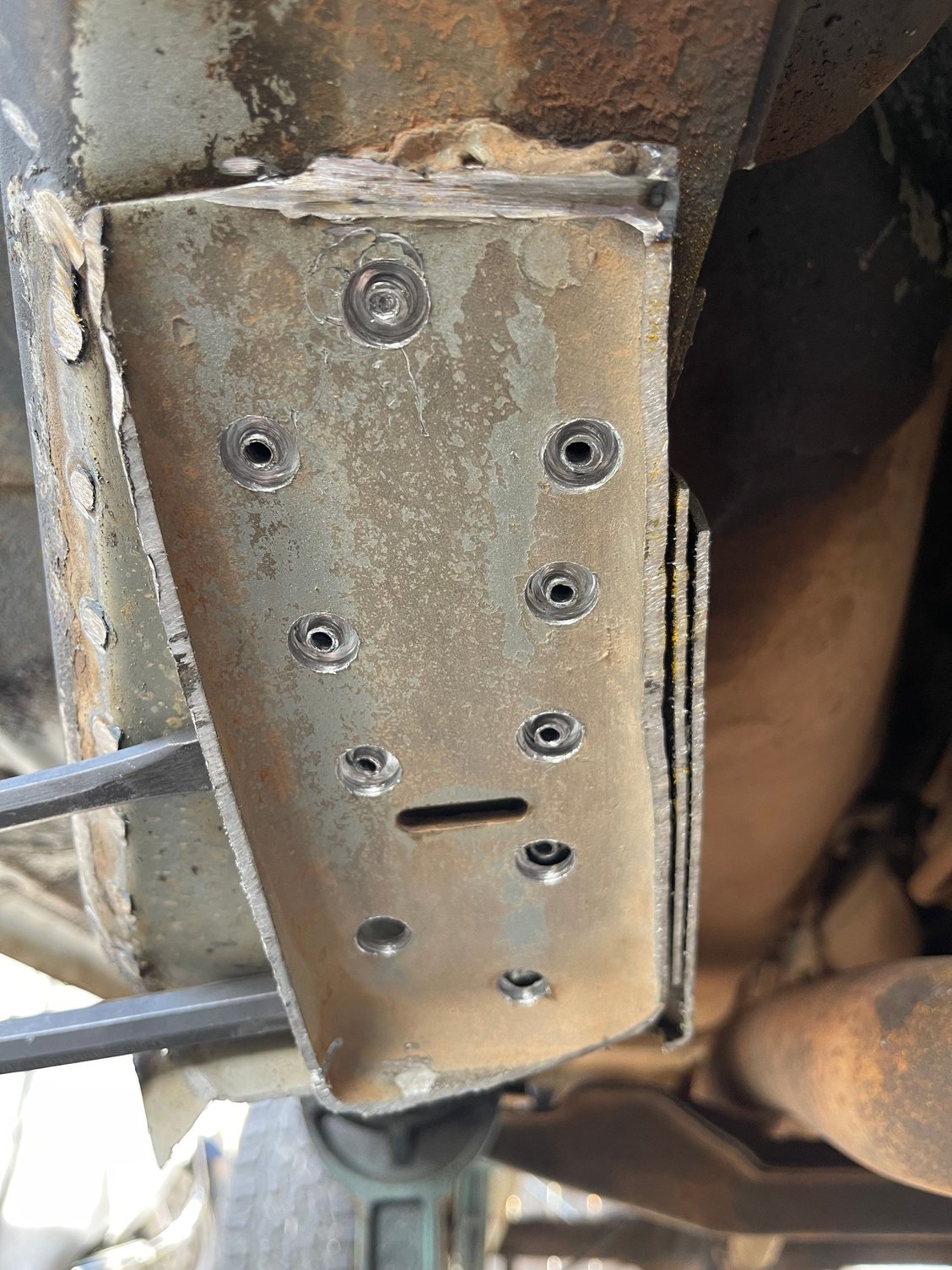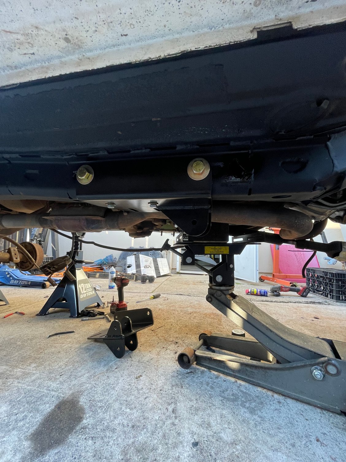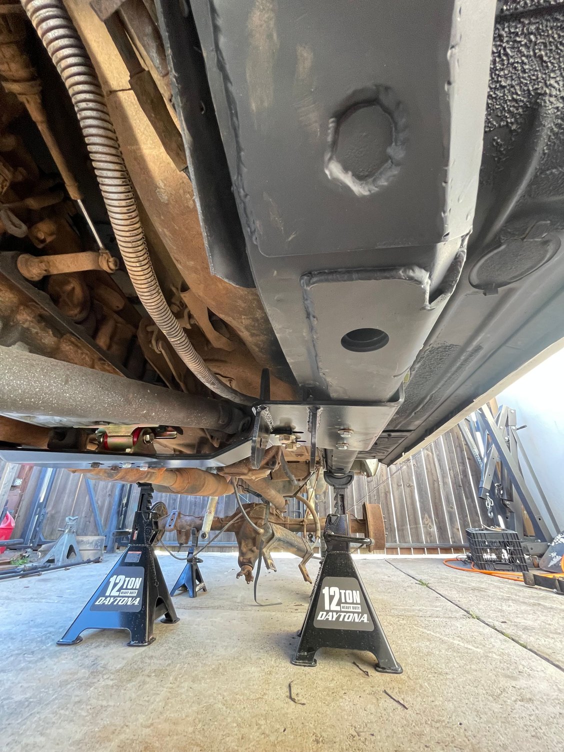 Drilled the holes to mount the the 4 link brackets. Got the passenger bracket mounted. Need to relocate my brake and fuel line before I can mount the driver side bracket. Stinkyfab trans mount