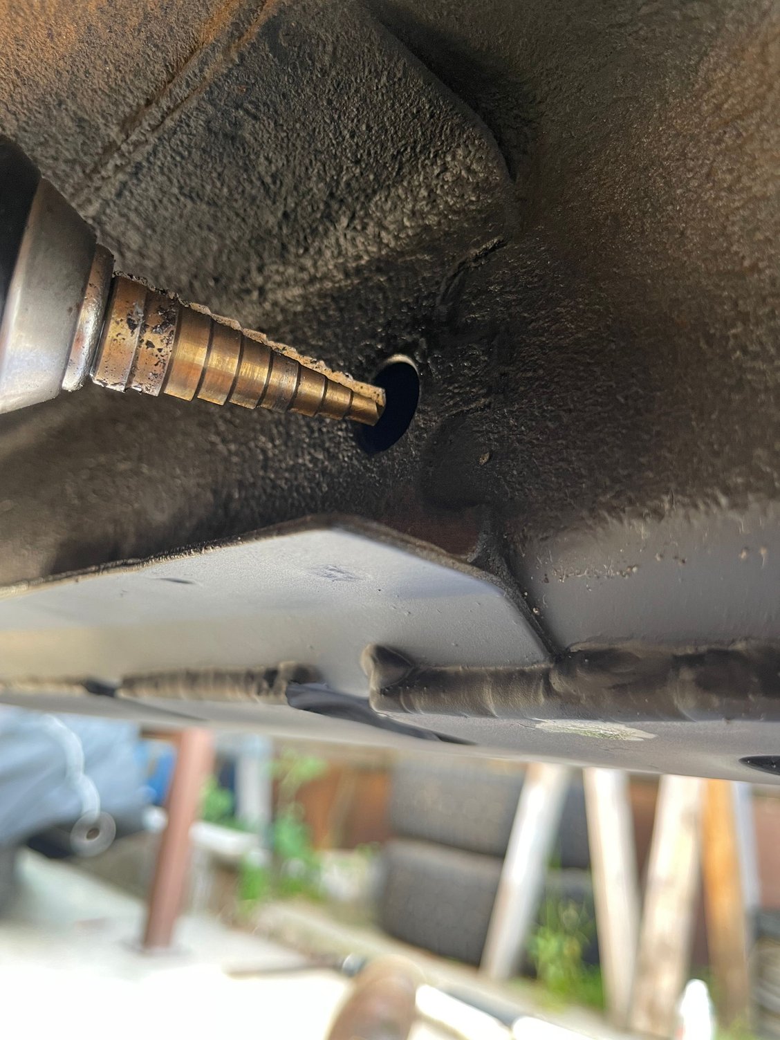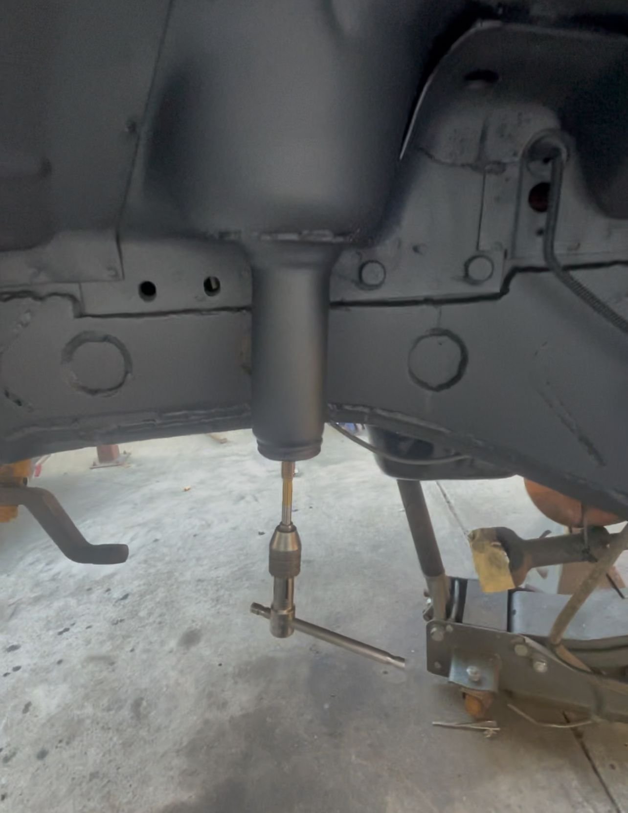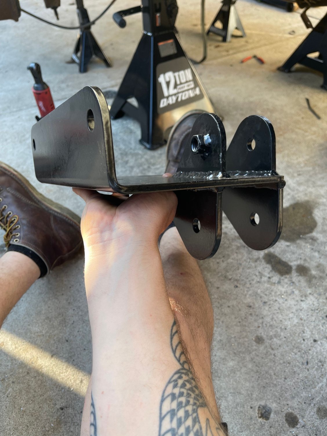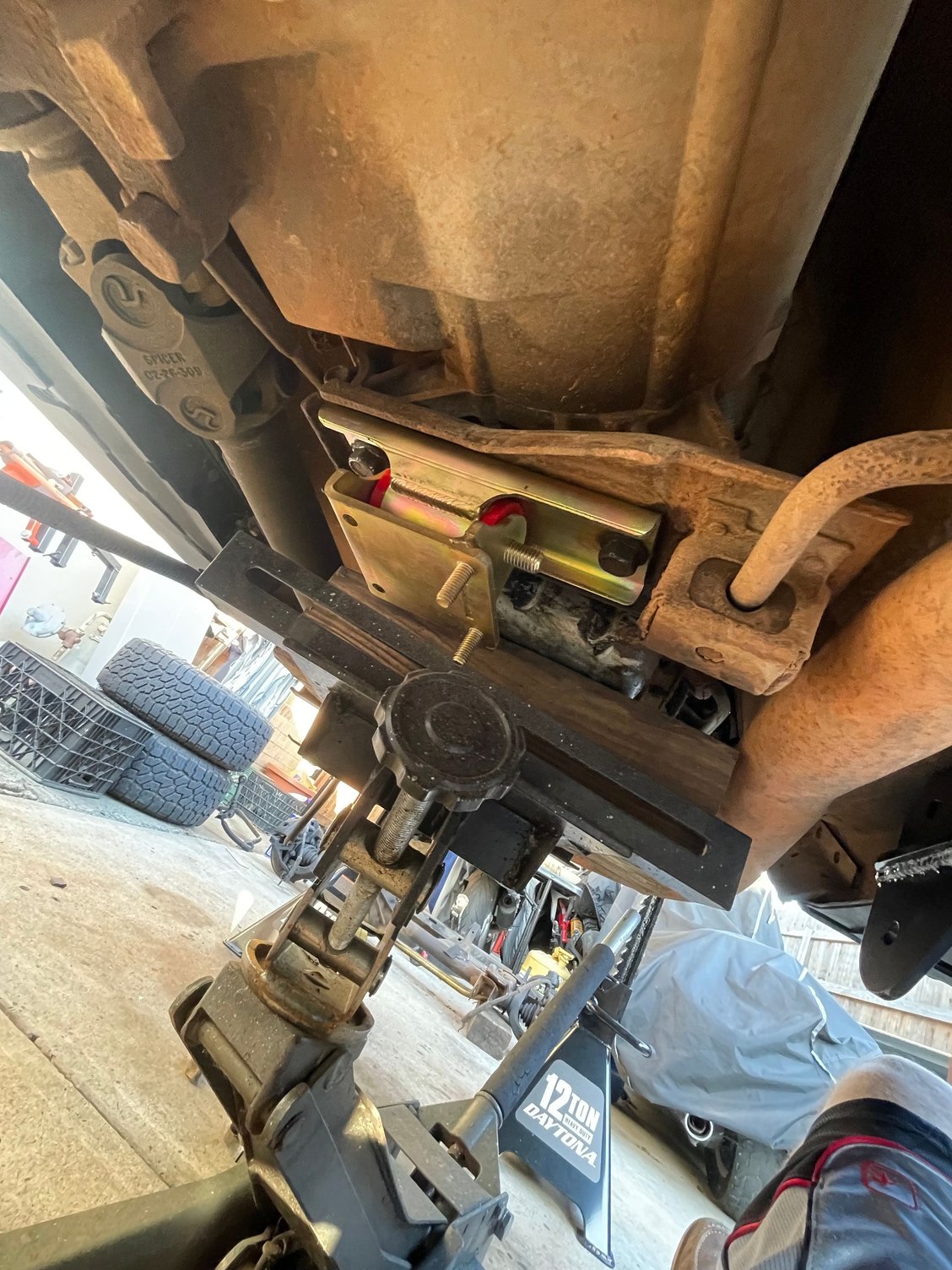 Drilled the holes to mount the the 4 link brackets. Got the passenger bracket mounted. Need to relocate my brake and fuel line before I can mount the driver side bracket. Stinkyfab trans mount