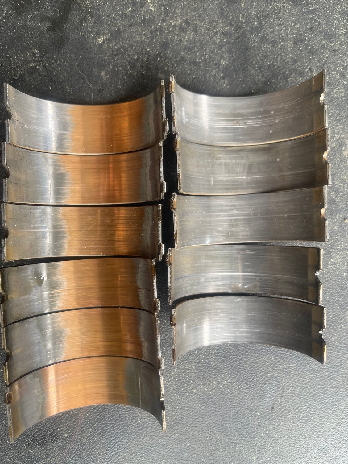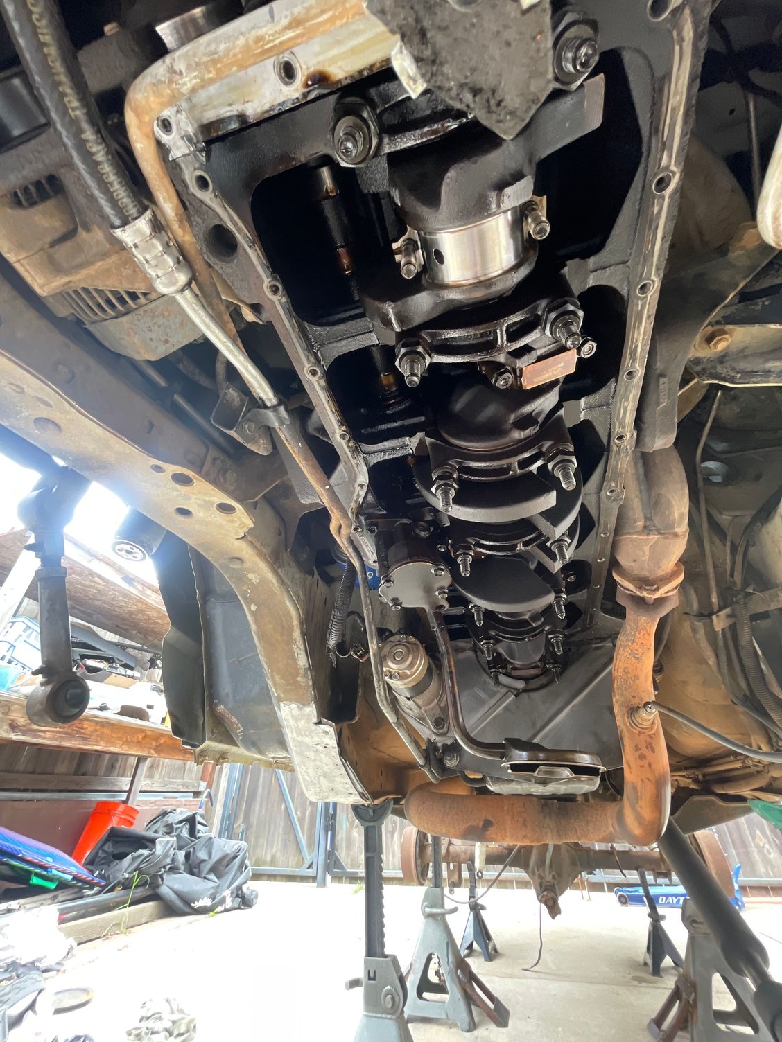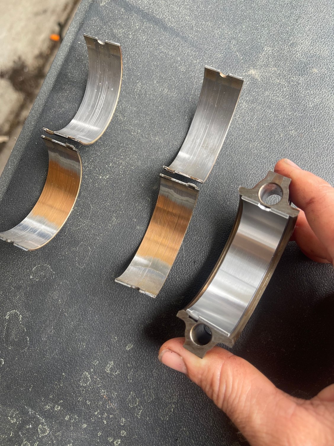 Washed all the mess away and with the axle out of the way decided to take care of the rear main seal, new oil pump and crank and rod bearings while I had the pan dropped. Crank looked good. Oil pressure would drop at hot idle. Main bearings were in good shape but the rod bearings were worn out. All the top shells. Now that it was all buttoned up I could go back to making a mess.