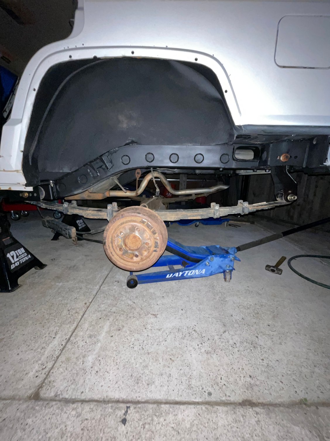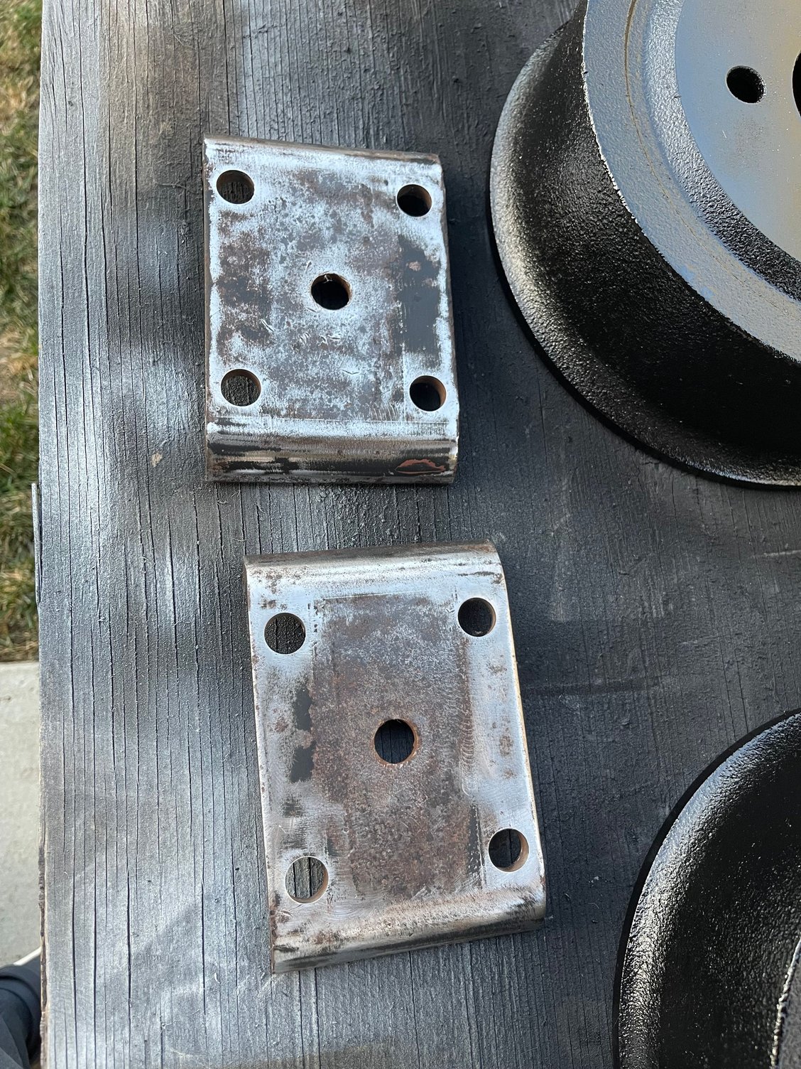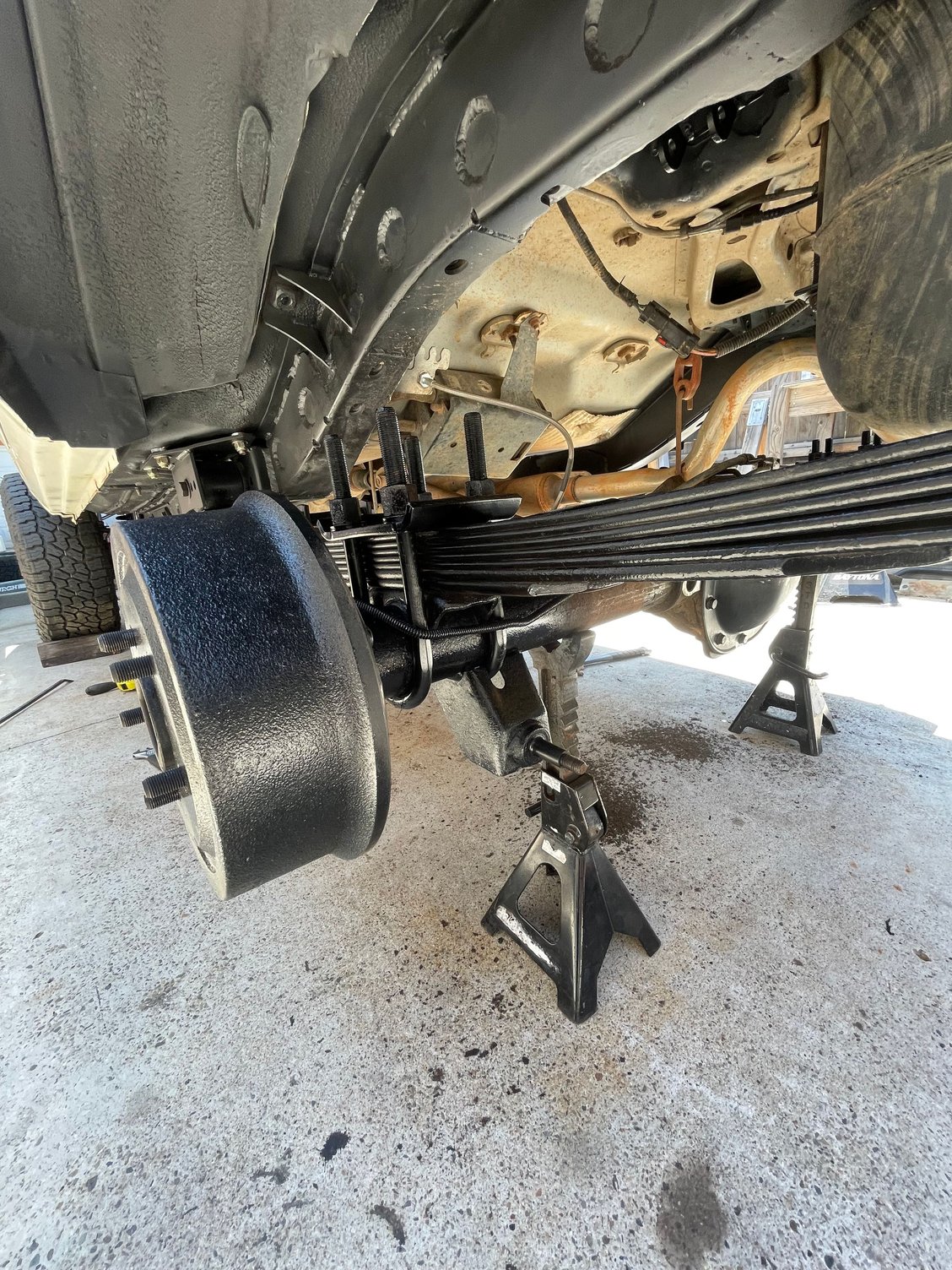 Got my new motor mounts on today, torqued down the leaf spring mounts, drums are done, brakes are bled. Drilled out my leaf spring plates so I can run larger u bolts, I’ll have those made locally.
