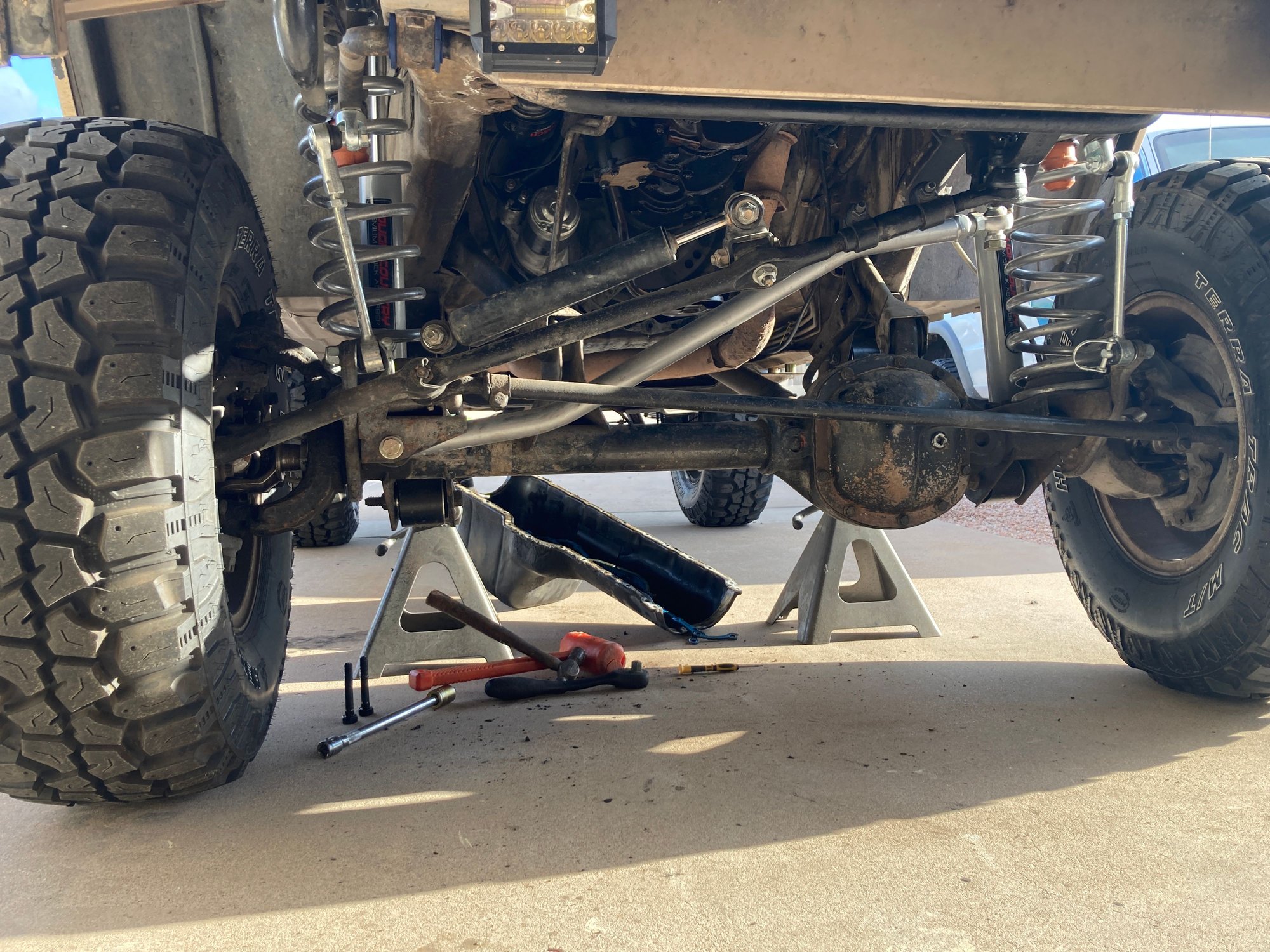 RMS and oil pan are in, Took off the transmission skid plate, Will probably screw around with the rear axle/driveline to see if I can find the click in a few hours when the sun isn't so direct.