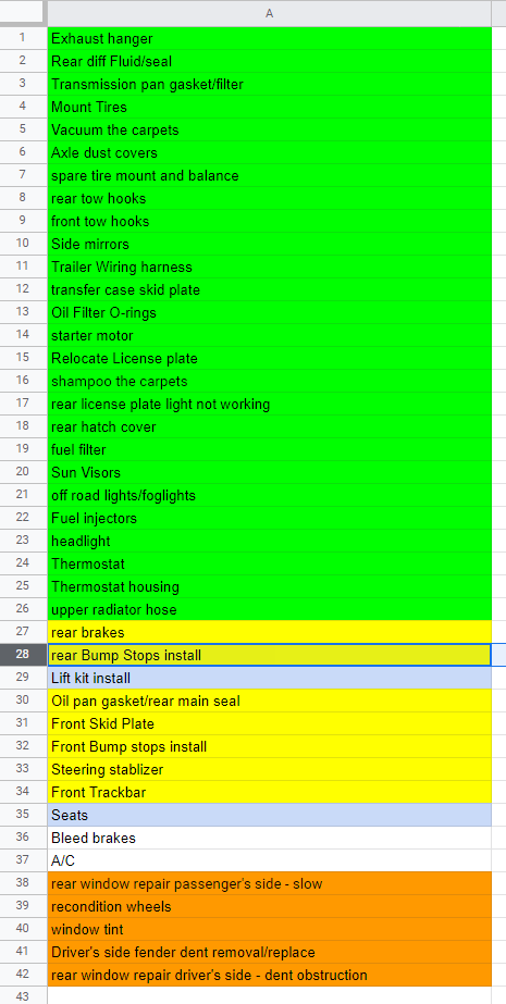 Yellow = I have the parts waiting to be worked on, right now this list is limited to the parts I'm going to install when I do the lift, I've done enough that as parts show up I'm literally just going out and putting them on the jeep, and they are going from blue to green.