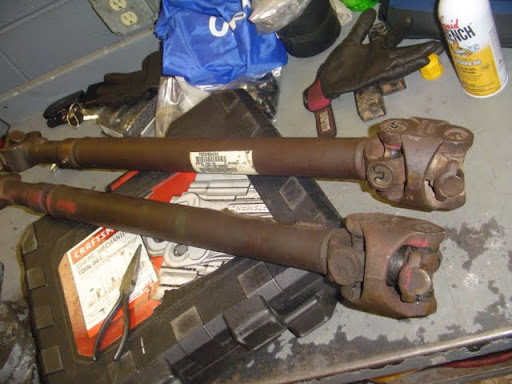 Here is my front driveshaft and my spare front driveshaft. The lower one in the picture is the one I use because it has a better ball joint. This is before I replaced all the u-joints on it: