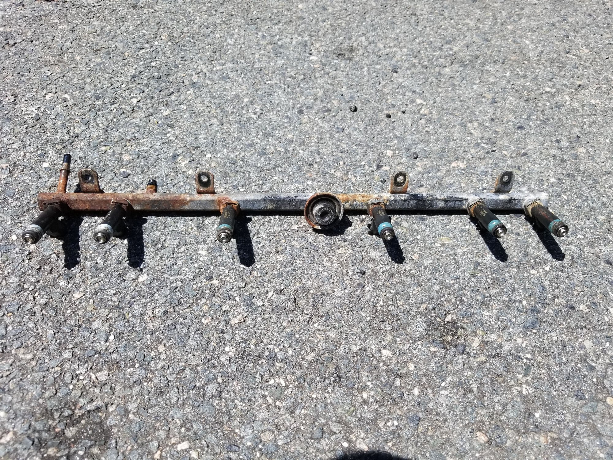 Putting the rail in time out on the pavement after a struggle to release it from the rusty claws of the fuel line.