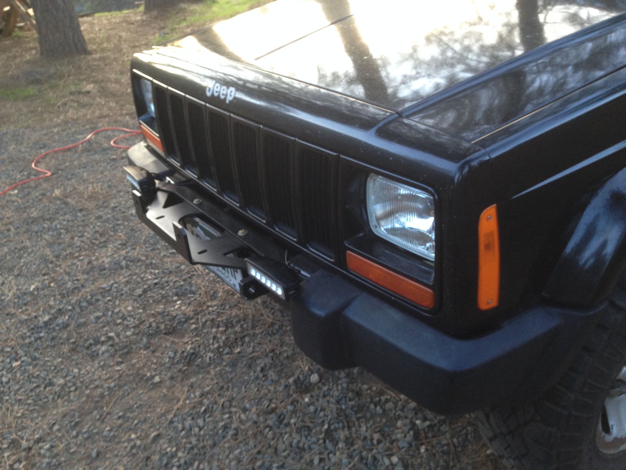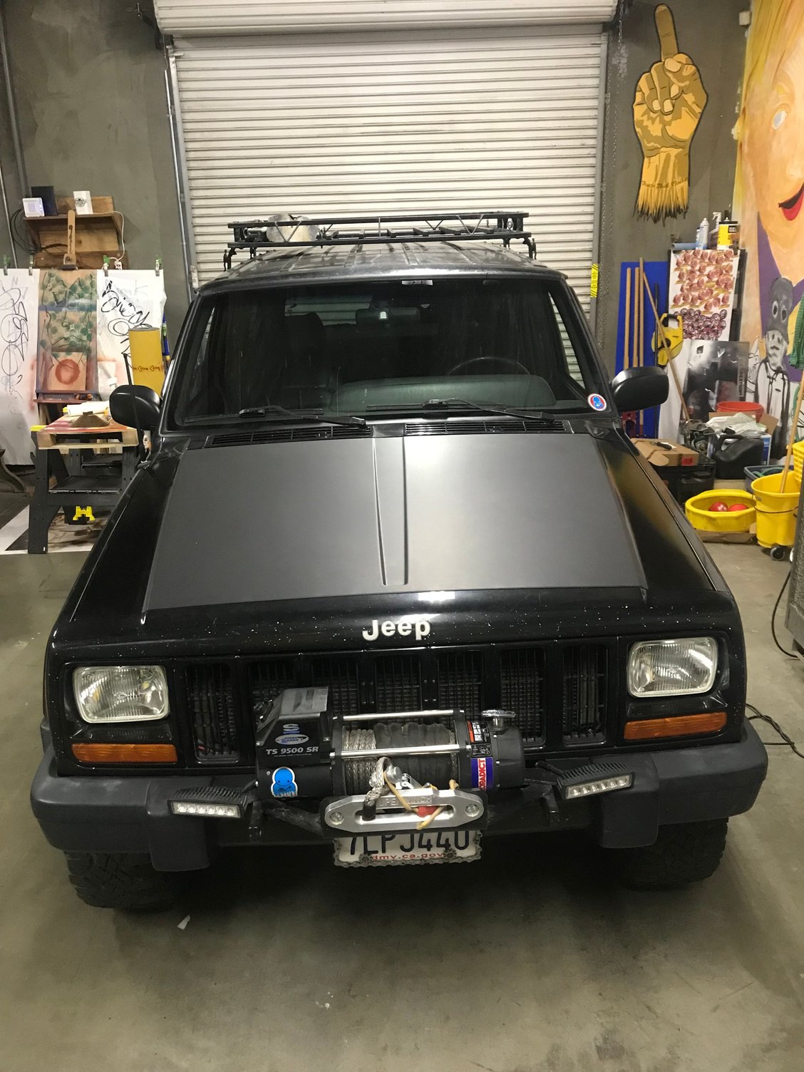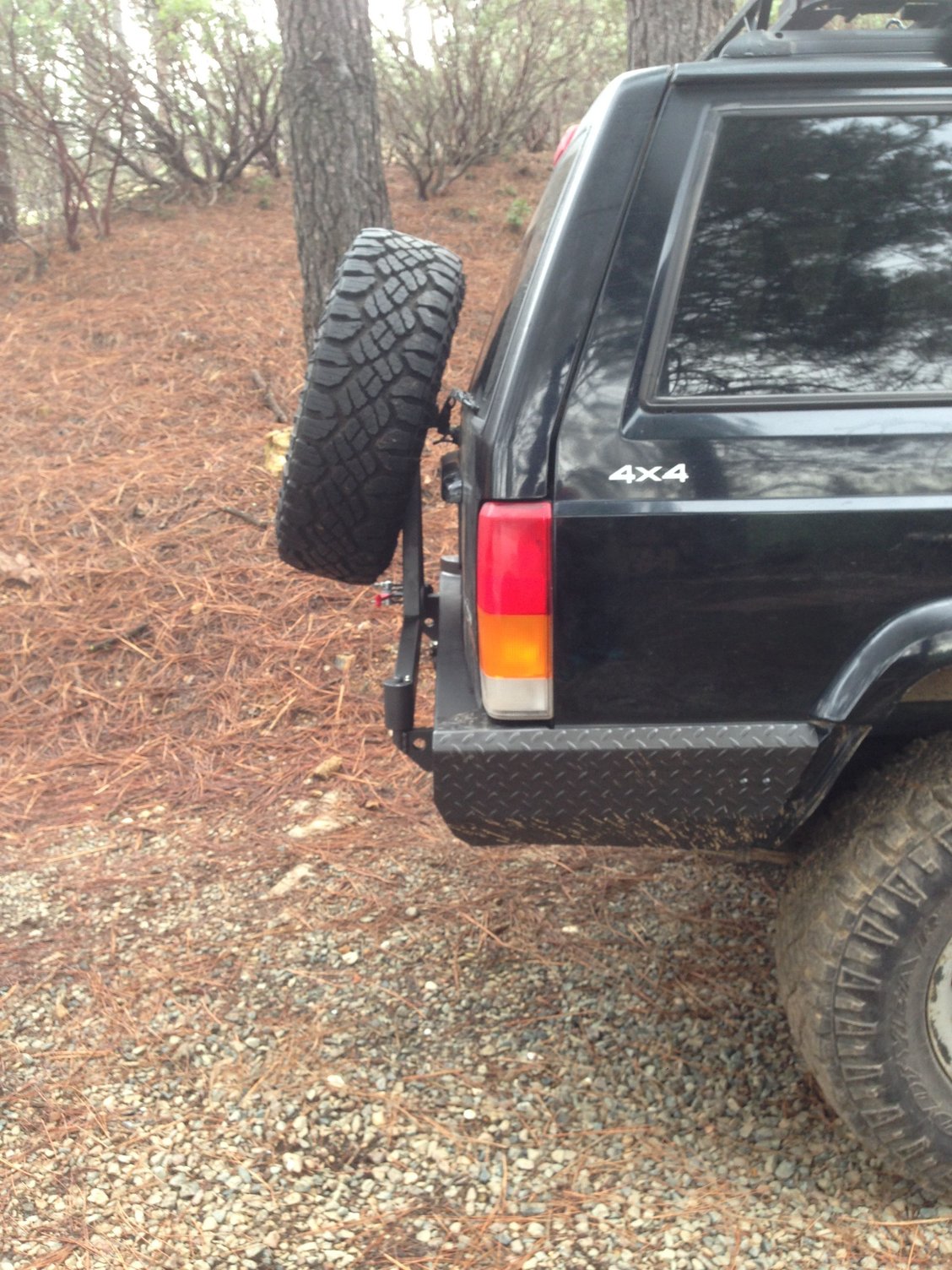 Beside wanting to get the spare tire out the cargo area, I also wanted some good recovery points in the back. I had Detours Off-Road Hardware build me one of their frame-stiffening xj rear bumpers with a swing out tire carrier, which I painted with some Rustoleum Hammered Black Detours rear xj bumper arrived primed. tire swing and hardware rear-bumper removal angled tire mount follows rear hatch lines left-offset tire placement blocks less of the rear window when looking over your shoulder for reversing.