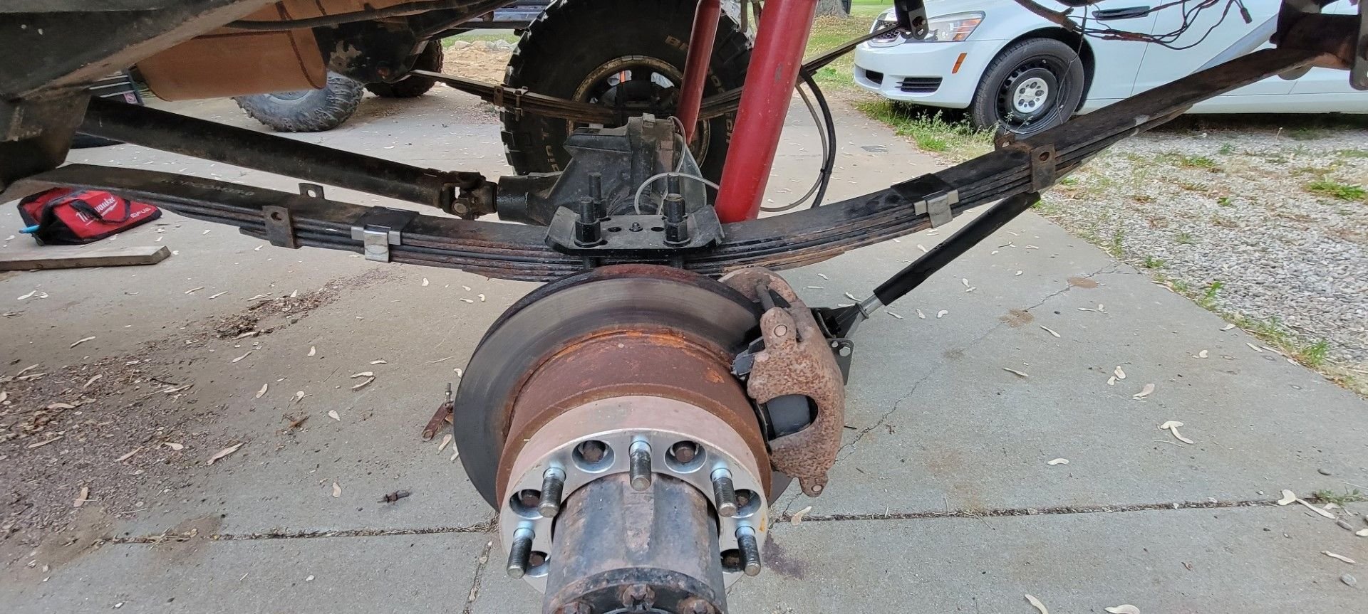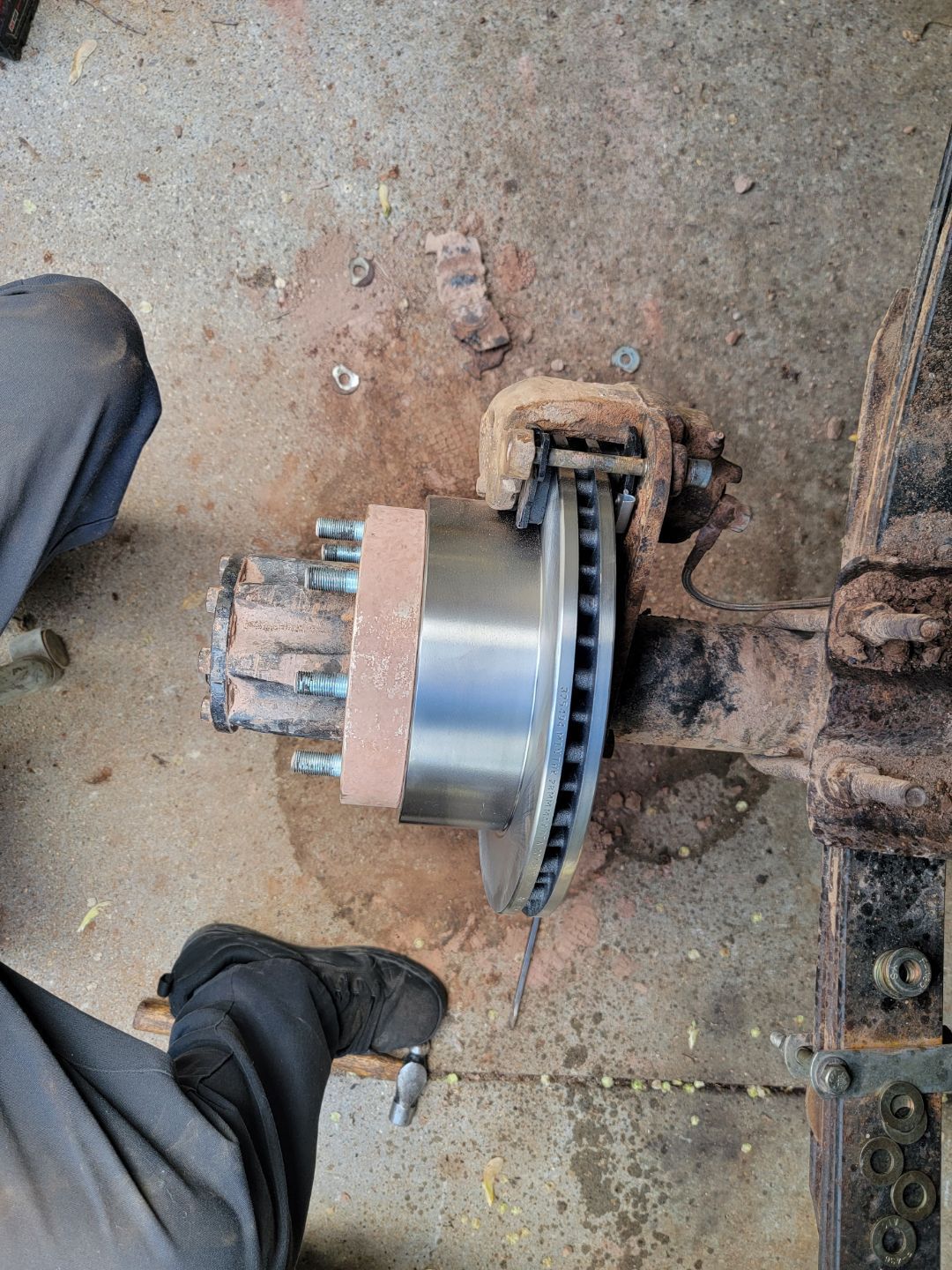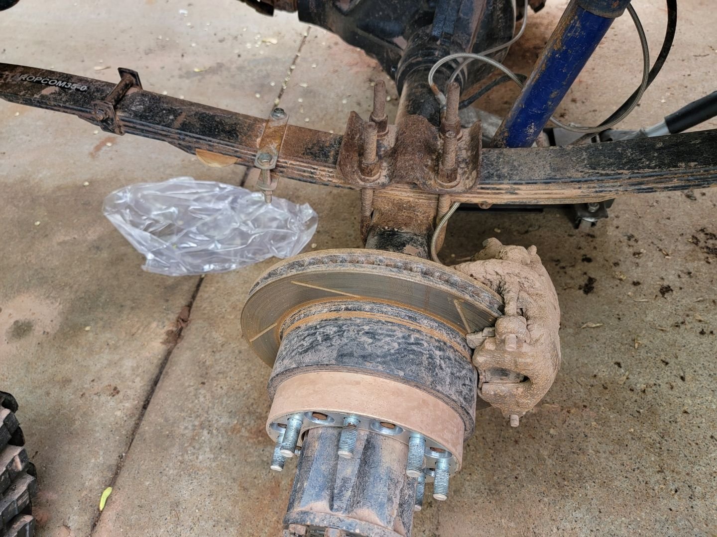 All four of these pads in the rear were metal-metal = Crazy! The pistons on the calipers were definitely extended out to their max! https://cimg8.ibsrv.net/gimg/www.che...aaf1f42a0.jpeg https://cimg0.ibsrv.net/gimg/www.che...ee9713710.jpeg So a new pair of E350 van single rear wheel brake rotors and early-mid 80s chevy JB6 caliper brake pads and its looking a bit more functional now. All of this from Rockauto for $127 shipped! https://cimg1.ibsrv.net/gimg/www.che...43e144690.jpeg I had to re-shim the adapter brackets as well. With the new pads in place the caliper would not clear the rotor and the pads were digging into the rotor as i tried to force it into place. A very precision deal here - formerly just 1 grade 8 - 3/4" hole washer between the bracket and axles flange. Now its equipped with 2 grade 8 - 5/8" hole washers per bolt. https://cimg9.ibsrv.net/gimg/www.che...6cbd21276.jpeg https://cimg2.ibsrv.net/gimg/www.che...396970711.jpeg |
