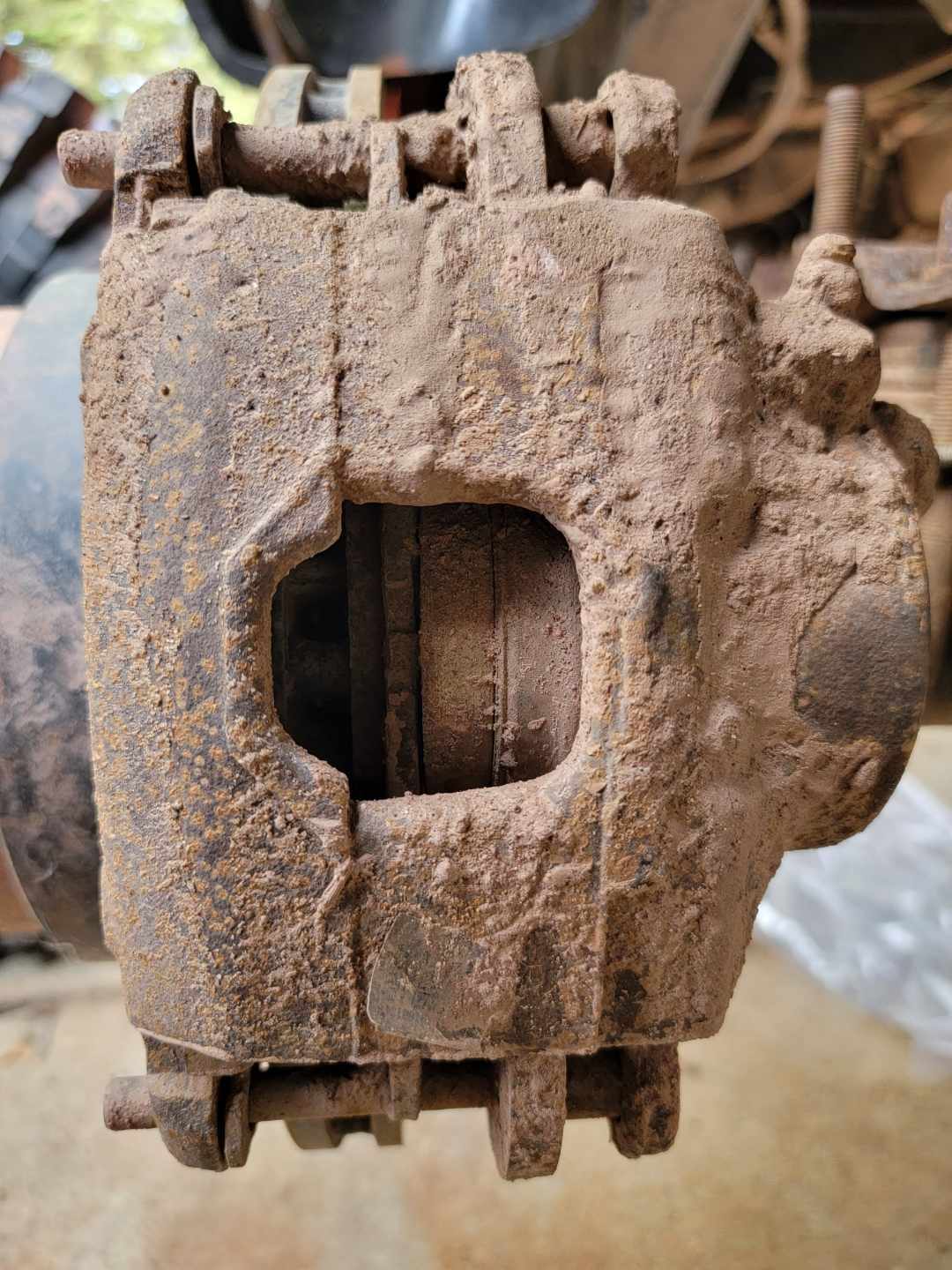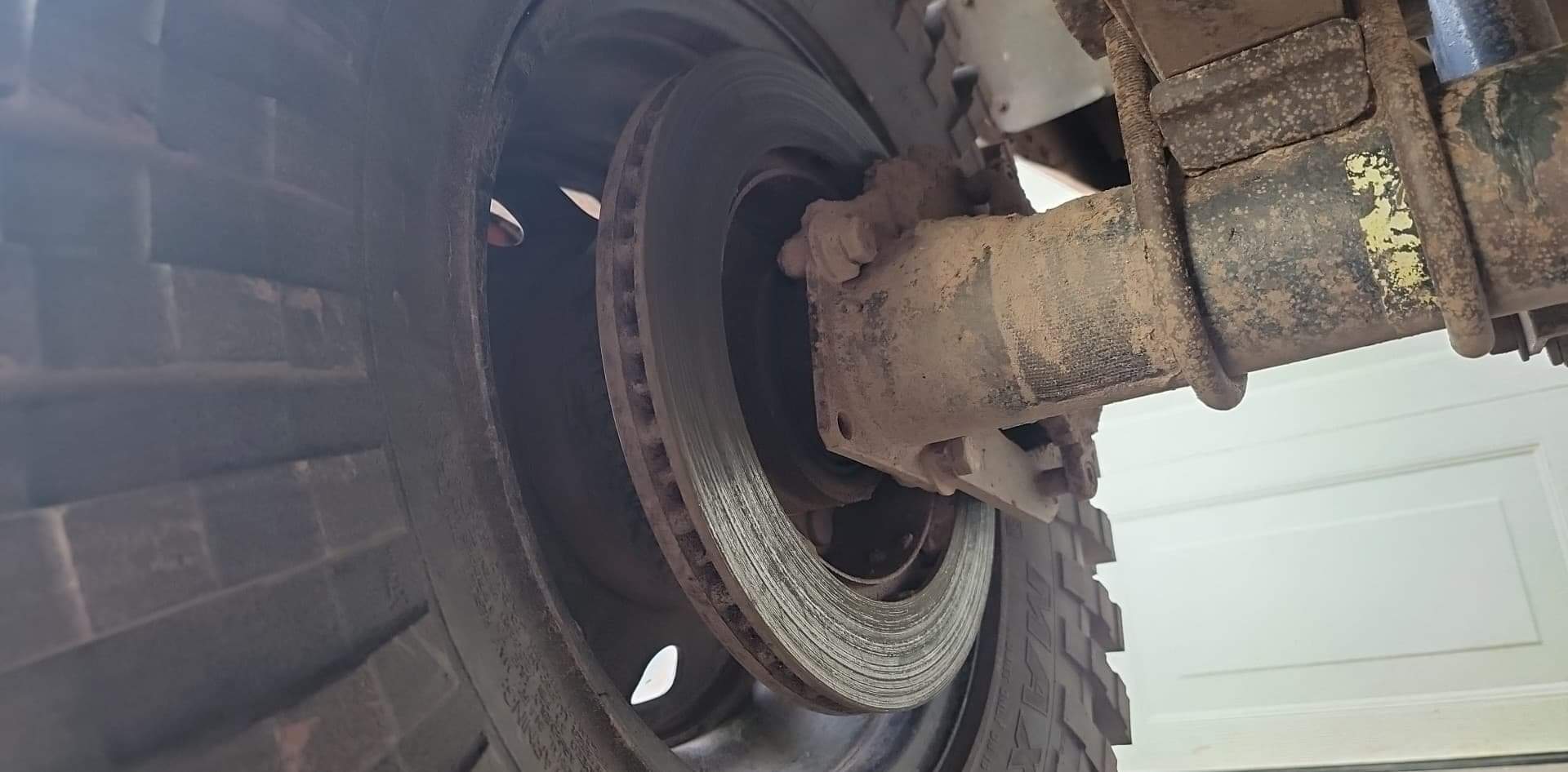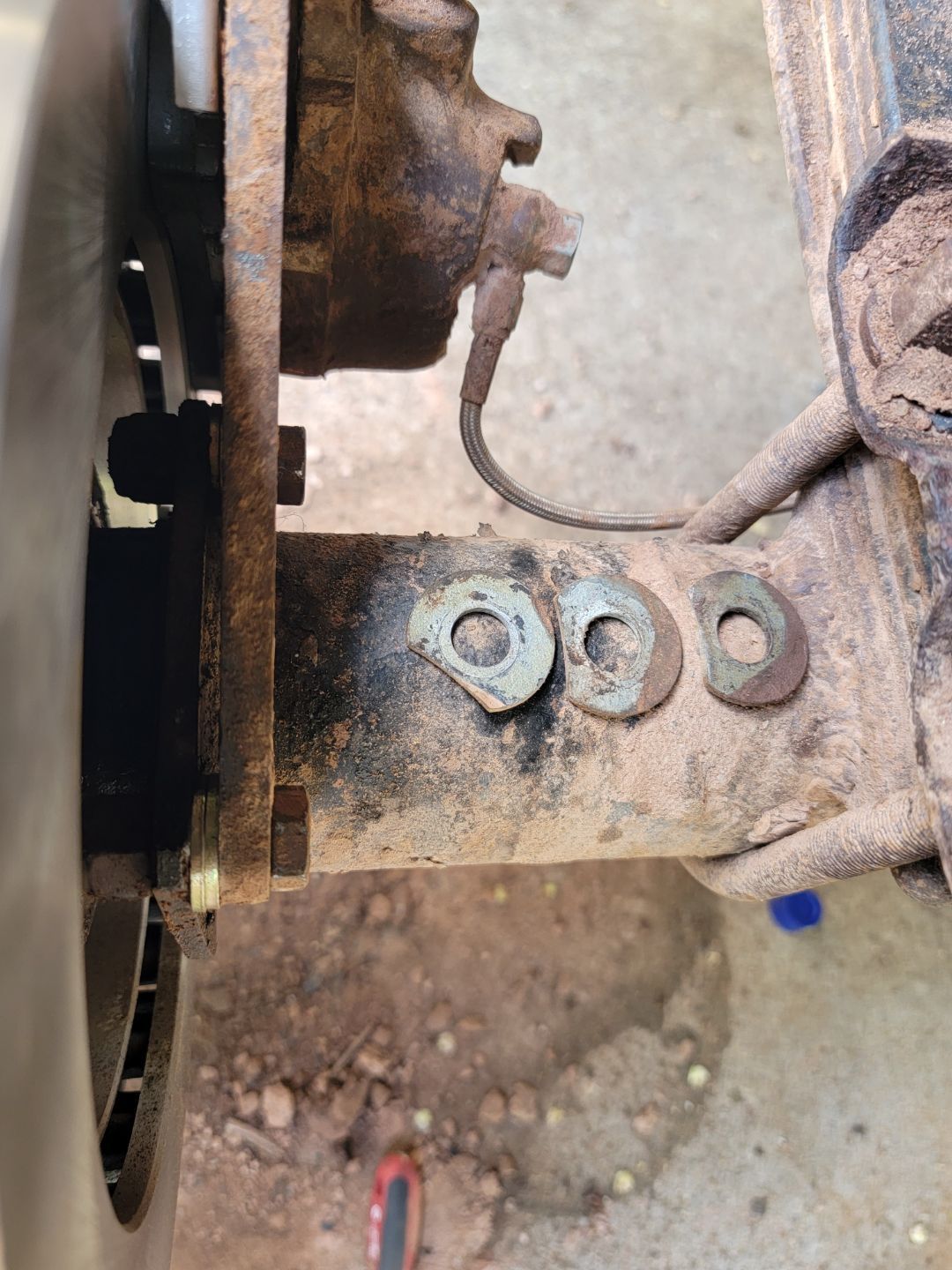 All four of these pads in the rear were metal-metal = Crazy! The pistons on the calipers were definitely extended out to their max! https://cimg8.ibsrv.net/gimg/www.che...aaf1f42a0.jpeg https://cimg0.ibsrv.net/gimg/www.che...ee9713710.jpeg So a new pair of E350 van single rear wheel brake rotors and early-mid 80s chevy JB6 caliper brake pads and its looking a bit more functional now. All of this from Rockauto for $127 shipped! https://cimg1.ibsrv.net/gimg/www.che...43e144690.jpeg I had to re-shim the adapter brackets as well. With the new pads in place the caliper would not clear the rotor and the pads were digging into the rotor as i tried to force it into place. A very precision deal here - formerly just 1 grade 8 - 3/4" hole washer between the bracket and axles flange. Now its equipped with 2 grade 8 - 5/8" hole washers per bolt. https://cimg9.ibsrv.net/gimg/www.che...6cbd21276.jpeg https://cimg2.ibsrv.net/gimg/www.che...396970711.jpeg |