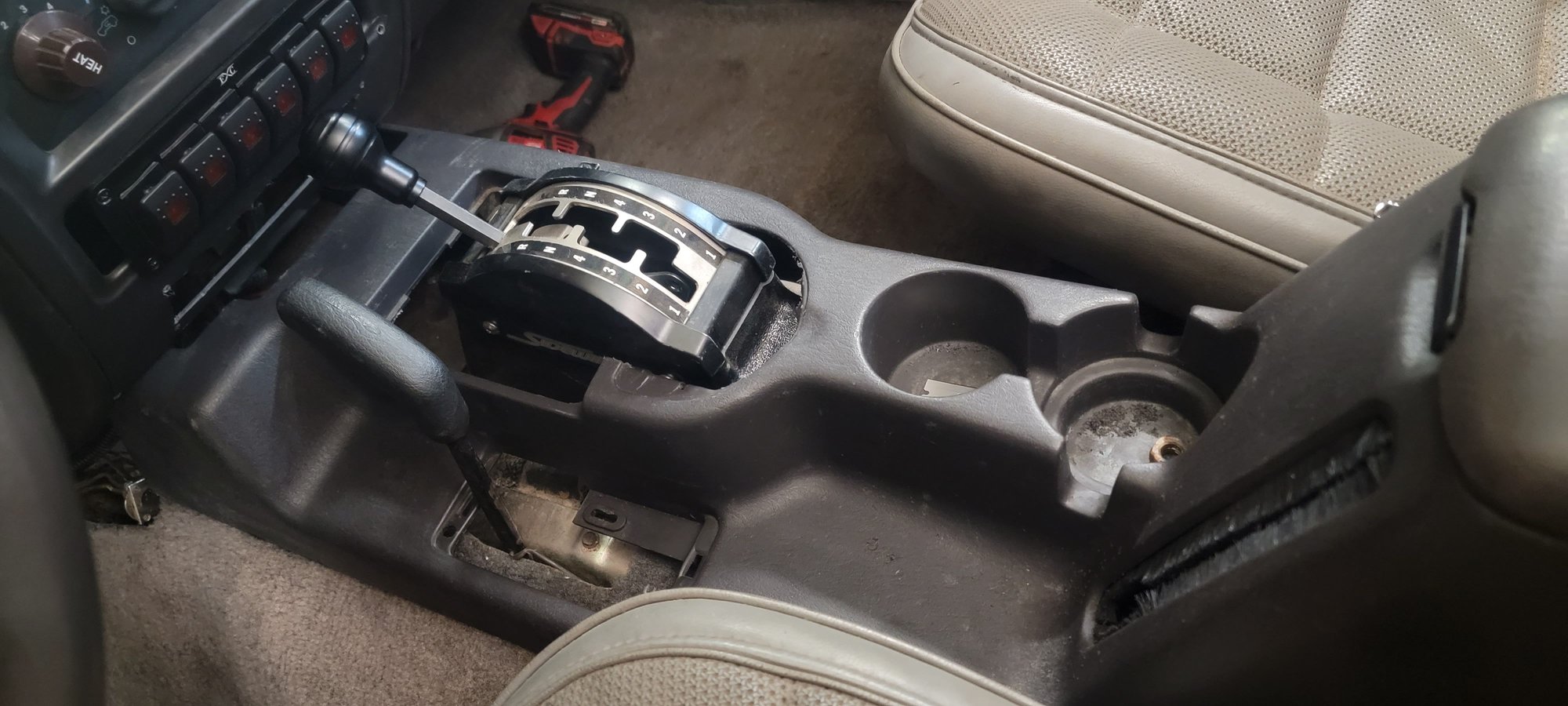 i need to dig up another tcase shifter to wither replace or modify this one with. The gated piece of metal that guides the shifter was removed by a previous owner. This doesn't really hinder the shifting but the shifter itself is rather sloppy in side to side play. Would also like to fit the tcase shifter bezel and potentially a simple trim piece to make up the gaps around the winters shifter for the tcase. BTW how about them cup holders 😉