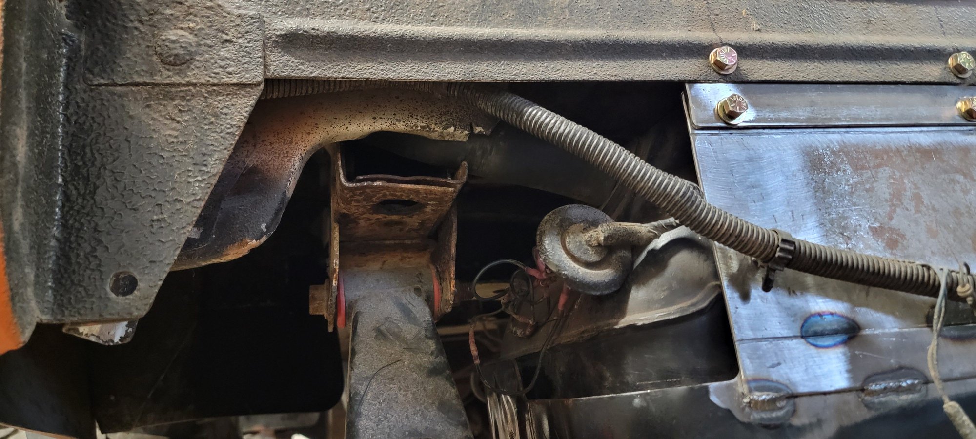 Faint but the 2 yellow X's are where the new mounts will.bolt through the 1" lip of the unibody X brace.