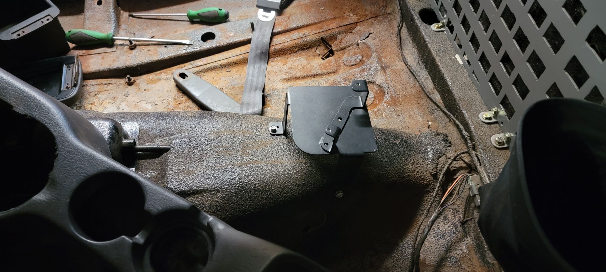 So lately ive been taking care of little things like new speakers, installing a disappointing bluetooth head unit ($30 from amazon so it is what it is).I pulled the carpet in favor of an actual MJ carpet replacement which for some reason led to figuring out the interior lights but settled on figuring out the placement of a newer style full length center console instead.