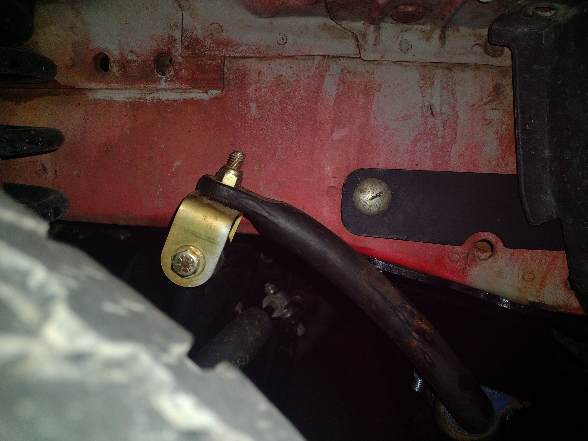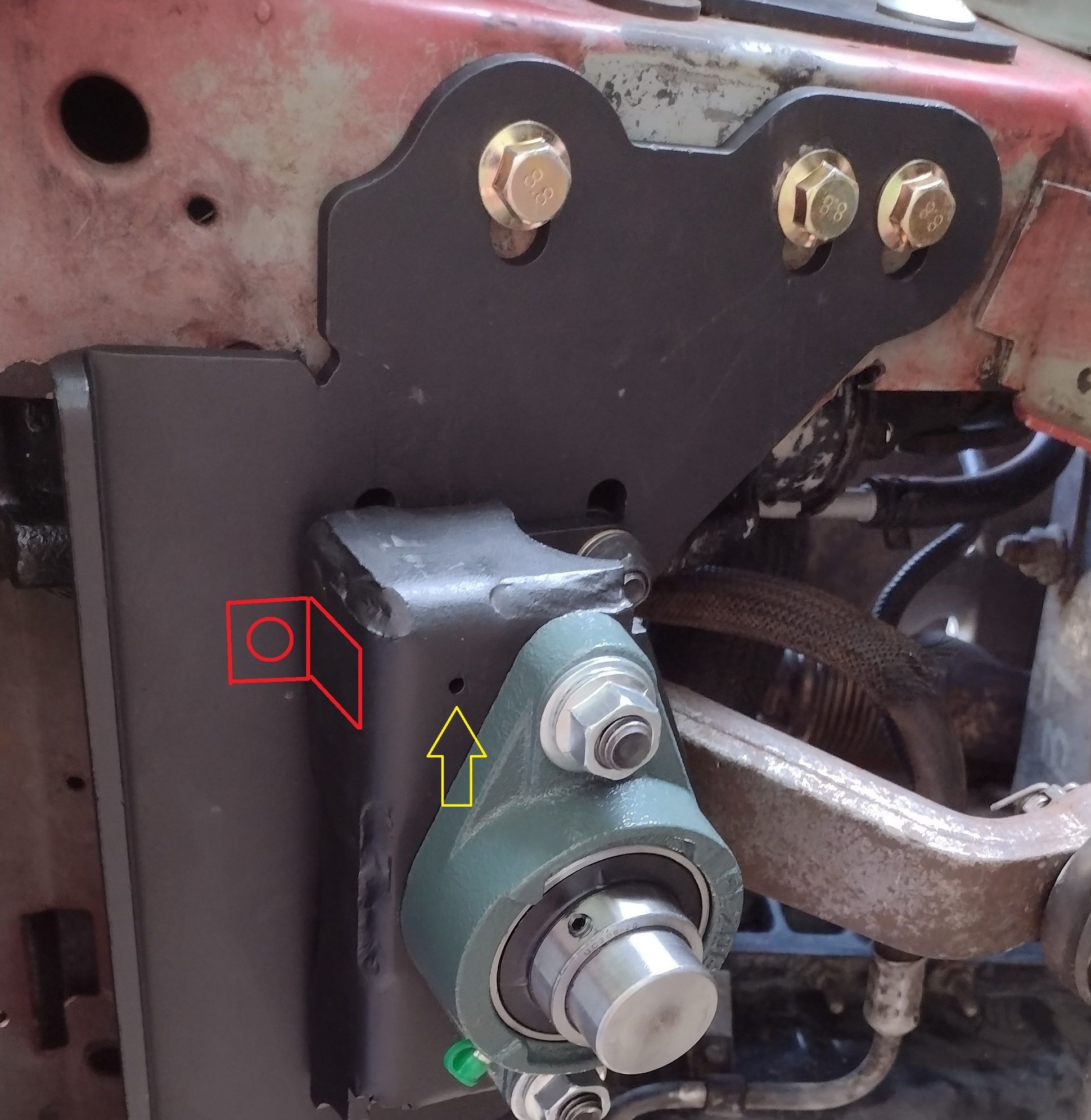 As I installed it, there is a missing bolt on the smaller black bracket just under that pinhole. It was a nightmare to get the bolt in position, and once I did, it interfered with the steering box pinch bolts and I could not center the pillow block. After a lot of attempts and ruminating on possible solutions, I decided to just leave it out and press on with the install.. I figure 3/4 bolts was still massively stronger than an unbraced steering box, the brace is made out of 1/4" plate and not going to be easily bent, and the steering box is over constrained at this point, so that ought to be enough. It's held in place by the stock 3 mounting bolts, the whole box brace pinch bolts, and the sector shaft bearing block.