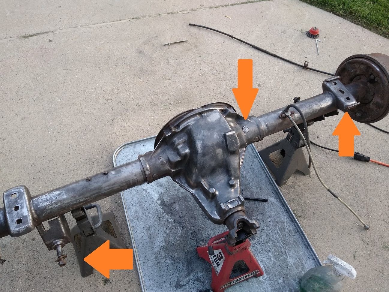 Last night I decided it was finally time to install the Truetrac axle. I'd been waiting too long trying to think of a way to make it perfect, when the truth is this axle is sort of a POS. It's got a leaky plug weld, one shock mount is bent along the threads, and of course, the previously repaired spring mount. I've pointed these out below.