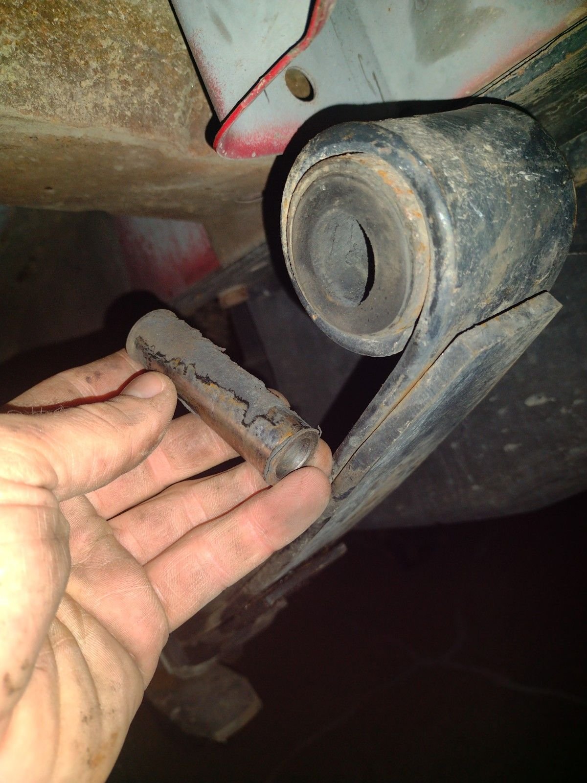 ...Their leaf spring bushings. I had been getting a squeak from the drivers rear suspension. I figured it was the shackles, as they were the only original part left on the suspension. The shackle bushings were fine, the new leaf spring bushings... not so much. They probably failed within 10k miles. Admittedly, the flex from off roading is hard on bushings, but I expected better. It looks like the rubber only really bonded in one spot. I'll need to research what I should buy next, but for now it's back together as is so I can get back on the road. Hopefully Moogs are cheap, I don't really want to go with poly bushings.