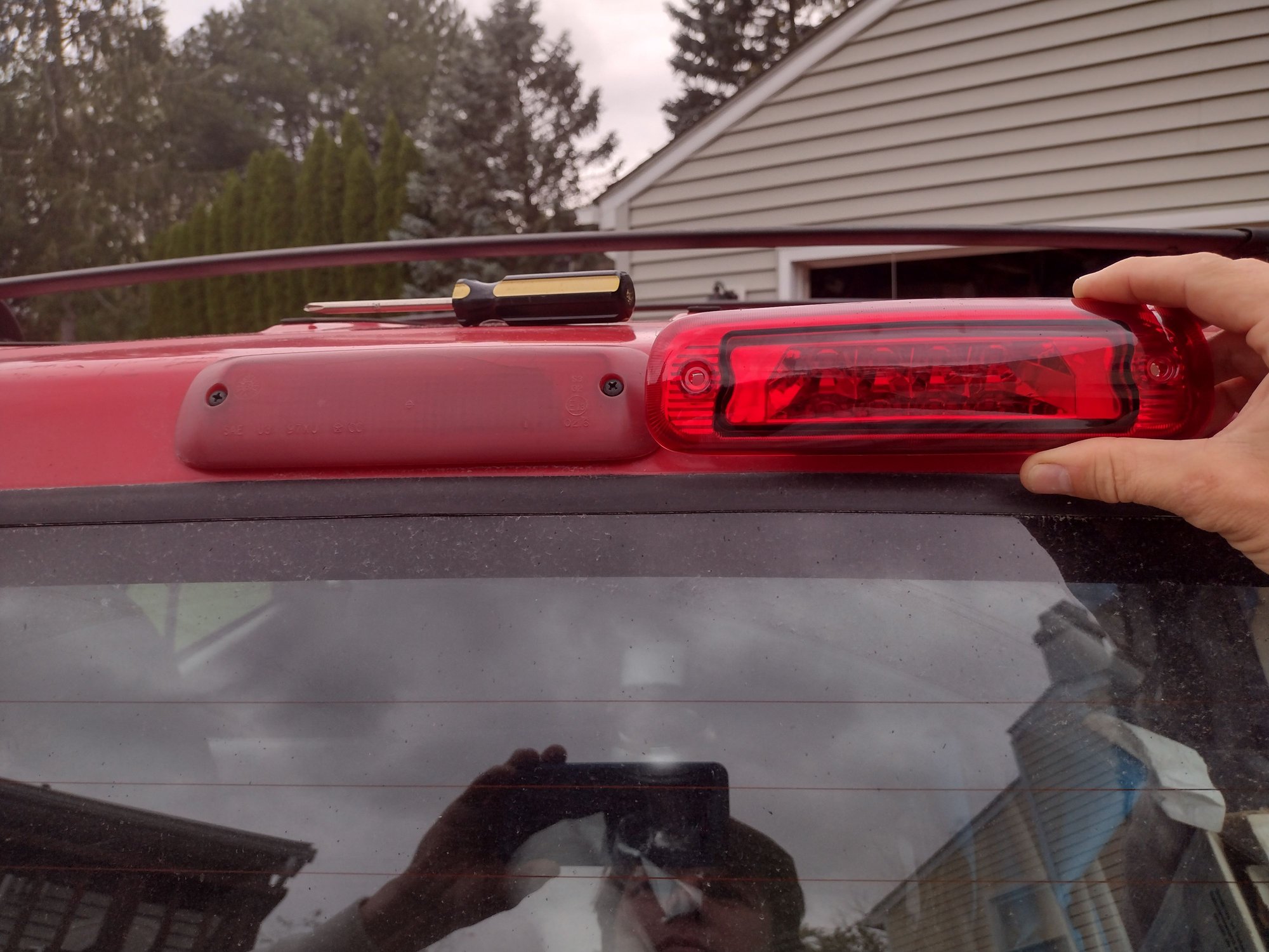 I also got a new LED brake light. For $15 it's hard to say no when the original is so cracked and dull I had to cut off the pigtail on the factory side, as the bulb replacement connection that came with the new one was too large for the stock bulb connector.