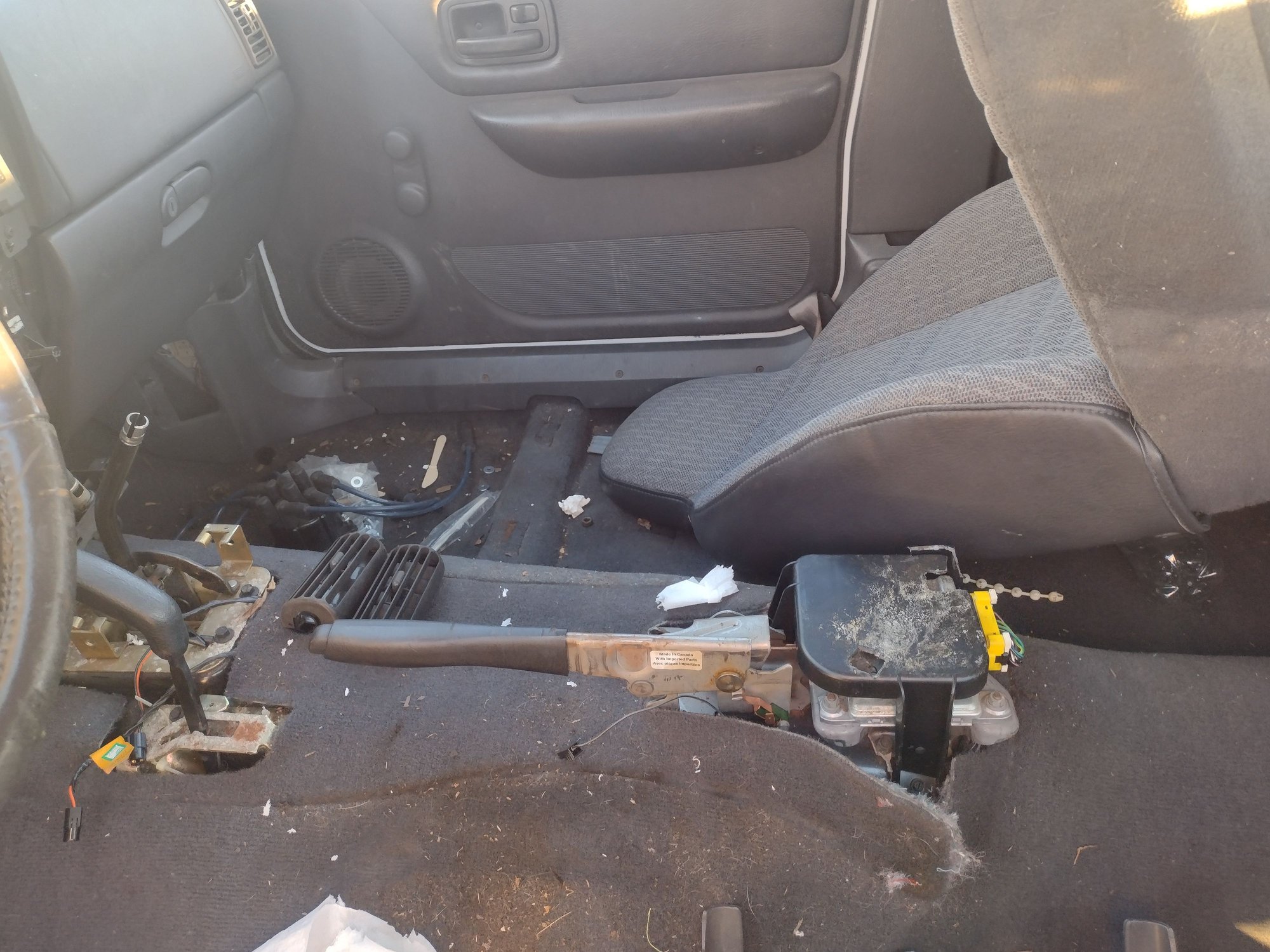 Another thing to note here: On 2000-01 XJs, the airbag computer got moved from under the drivers seat, to on top of the transmission tunnel, behind the parking brake and under the plastic table thing that holds the center console. There's a TSB out there to move the 99 and older ones to the new location, so I went ahead and grabbed the airbag computer and bracket holding it.