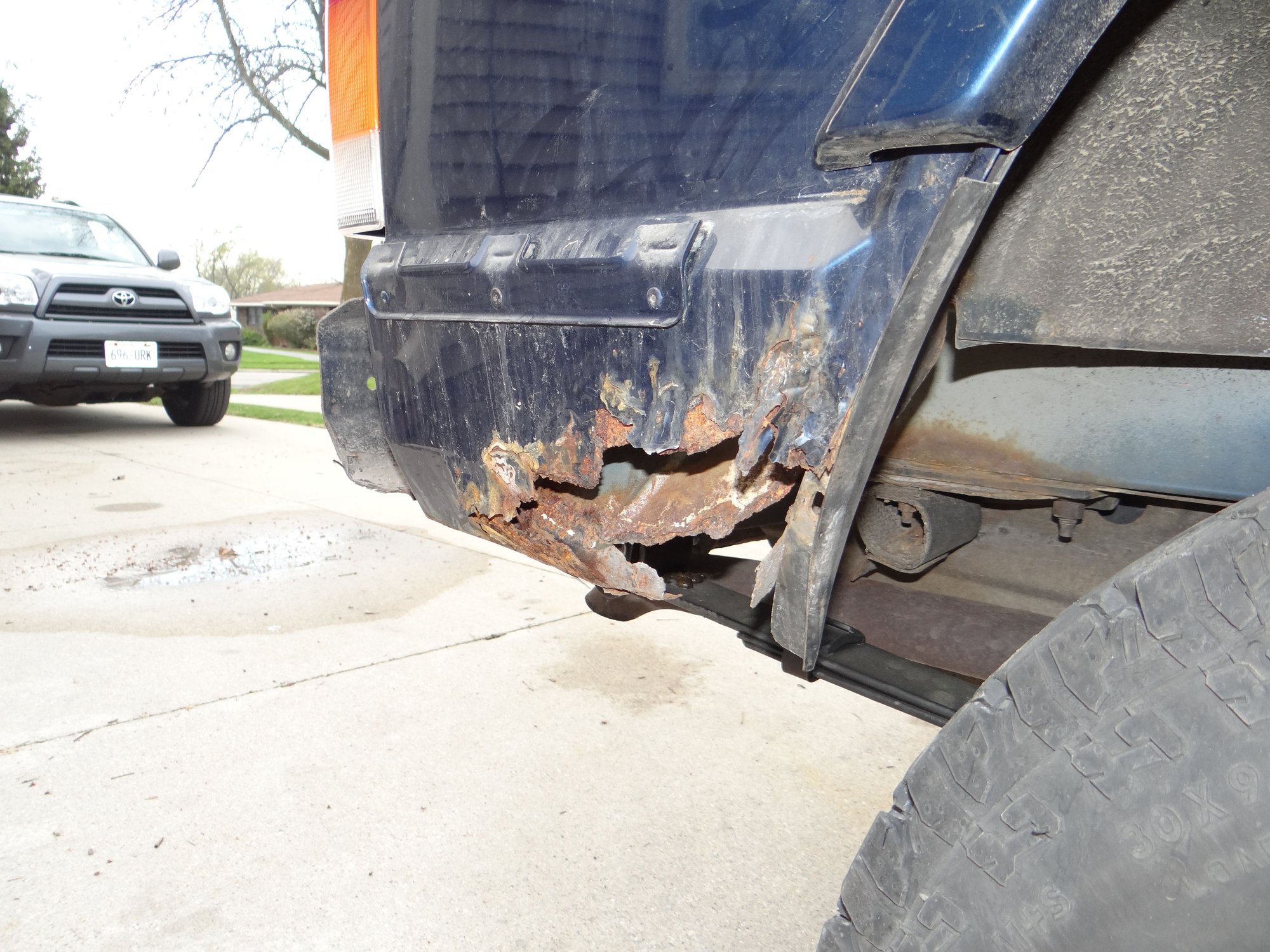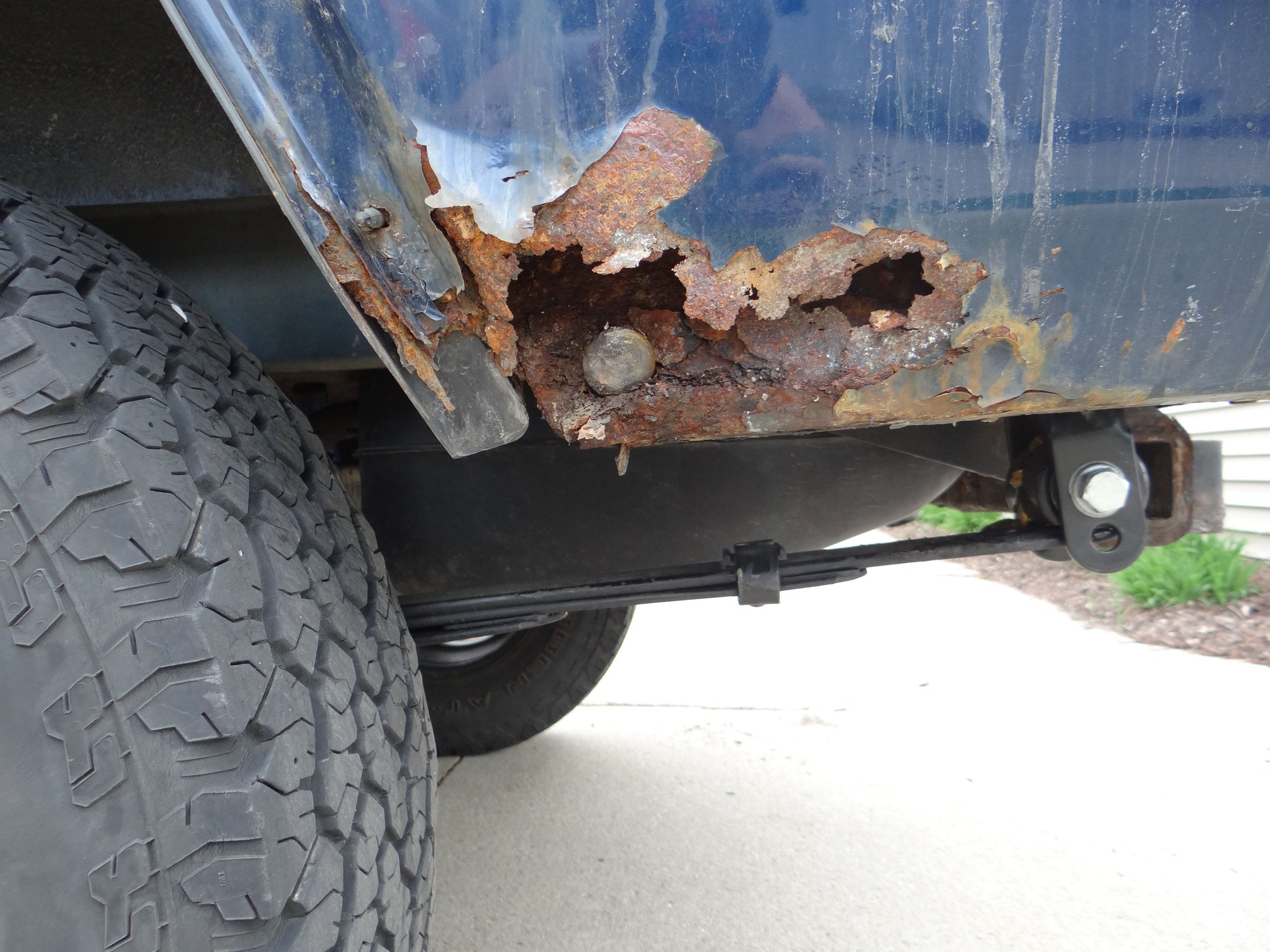 So the first thing I had to do was fix the rear upper shock mounts (because the bolts fell out while I was driving down the high way). When I climbed underneath, this is what I saw