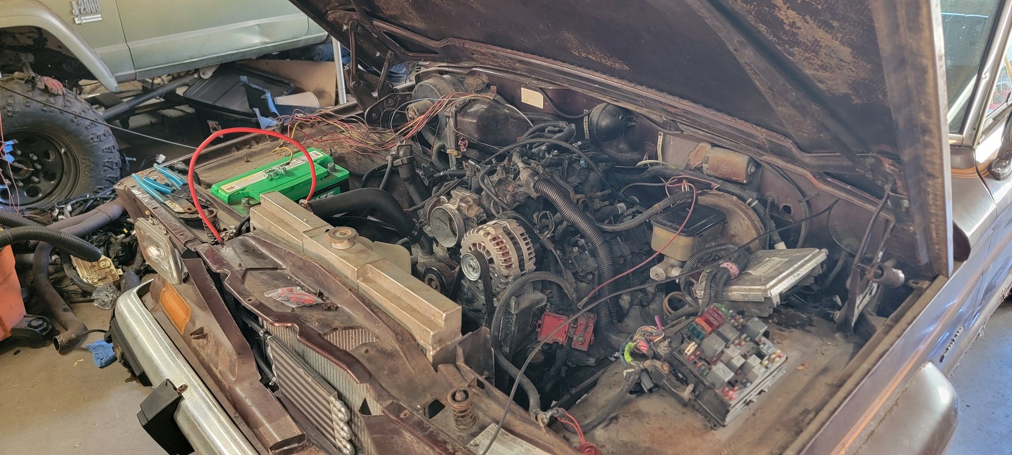 Finished off the afternoon with some sloppy LS harness placement. Wired the starter solenoid to fire off the FSJ harness, still need to find and wire the fuel pump through the LS harness and then make some power and grounds. I'm very wiring deficient soo I'm puzzled on the whole FSJ switched power from column and how that powers the LS harness???