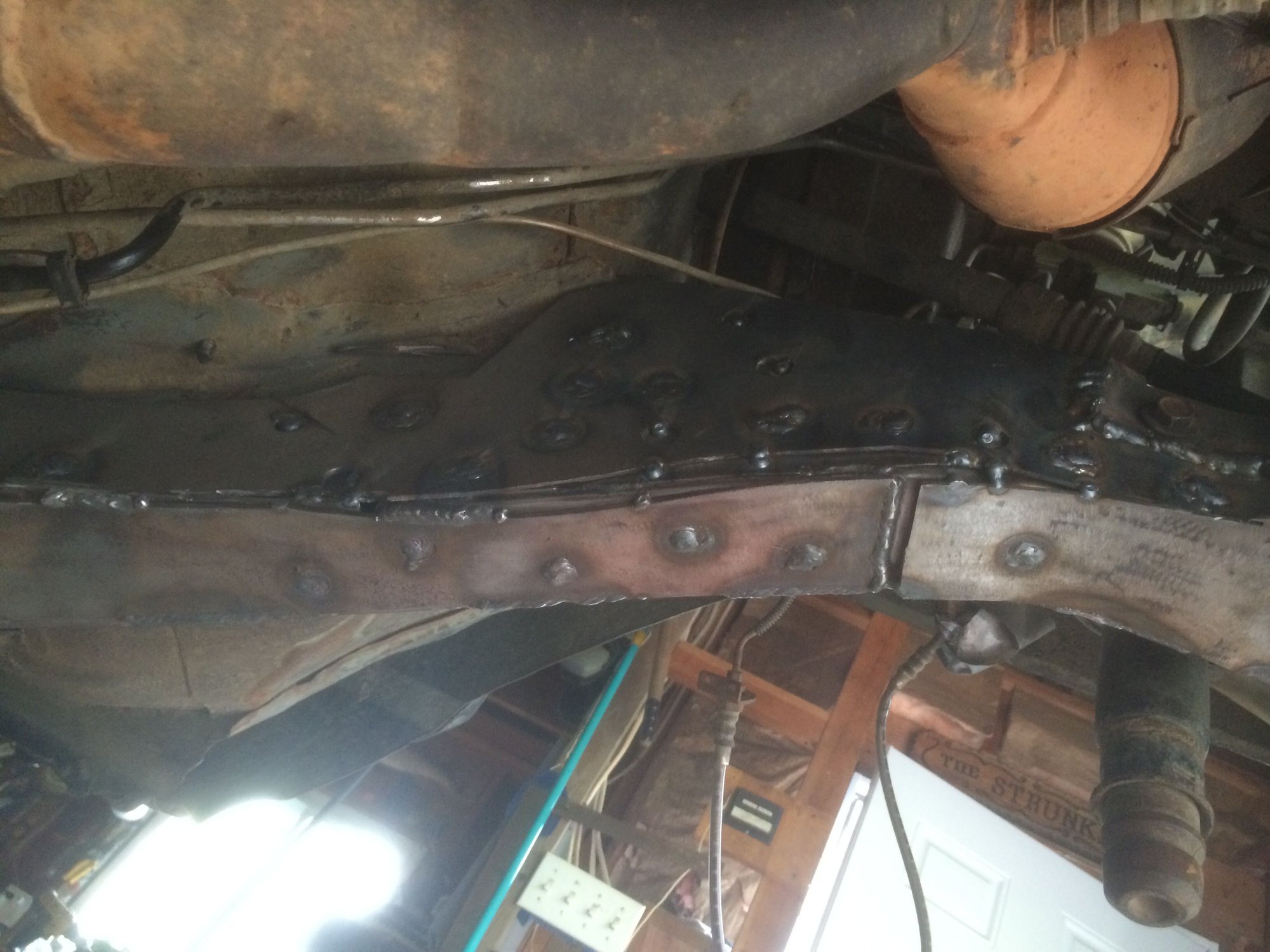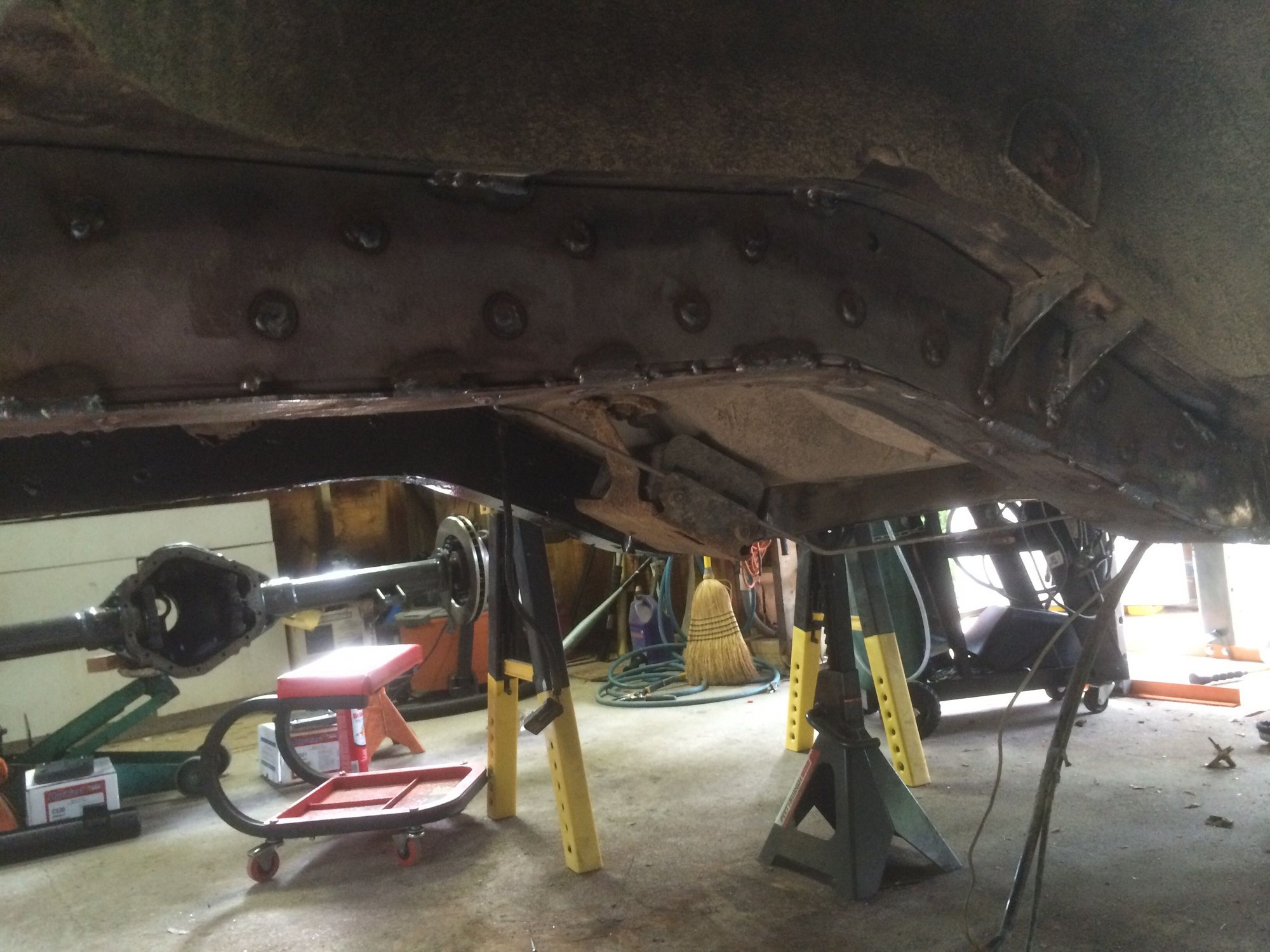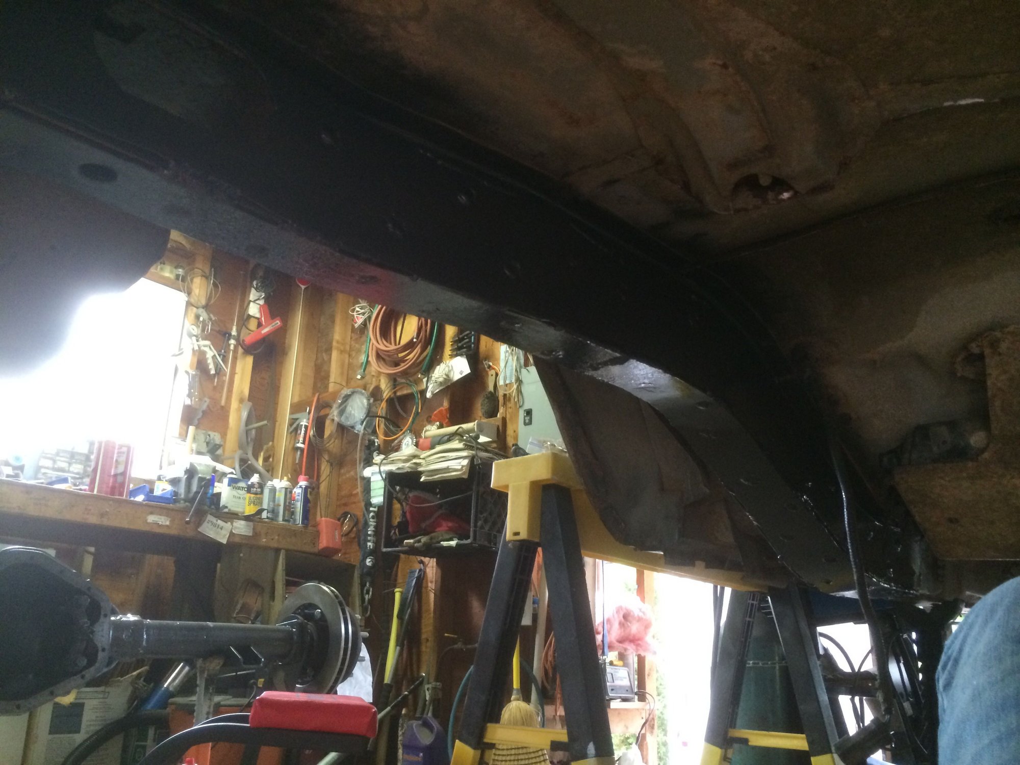 I cut out the old crossmember for the shock mounts, and plated the outside, bottom and inside from the c pillar back. It got painted and the axle underneath.
