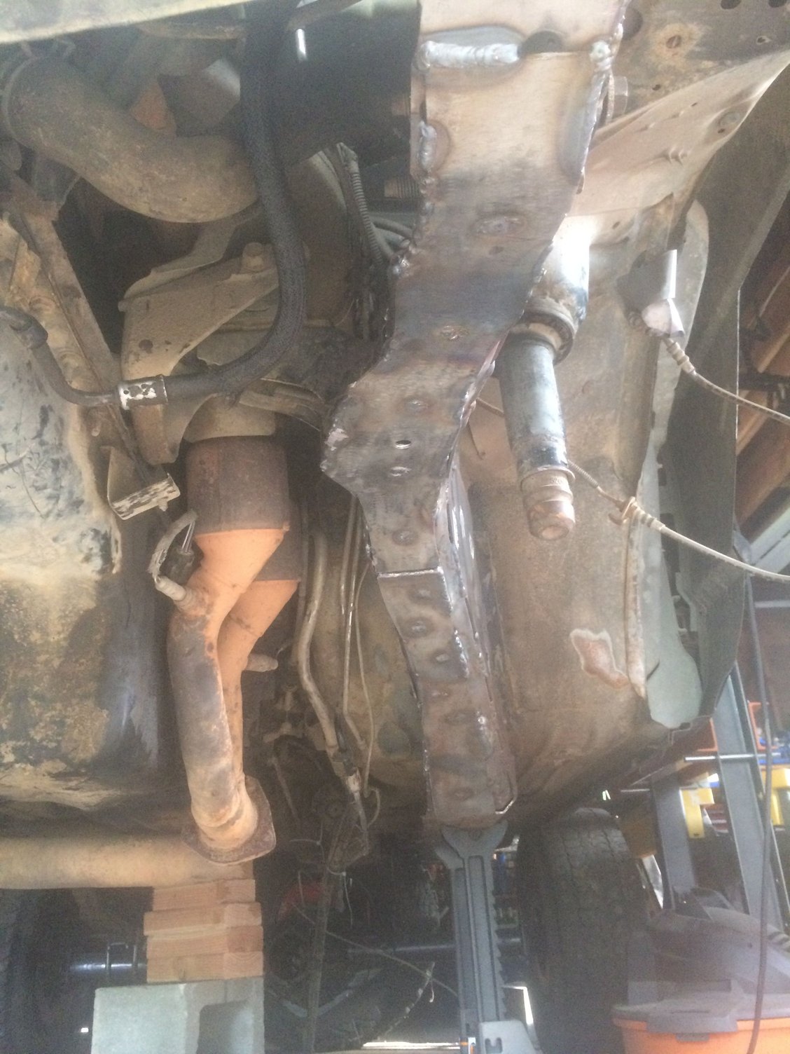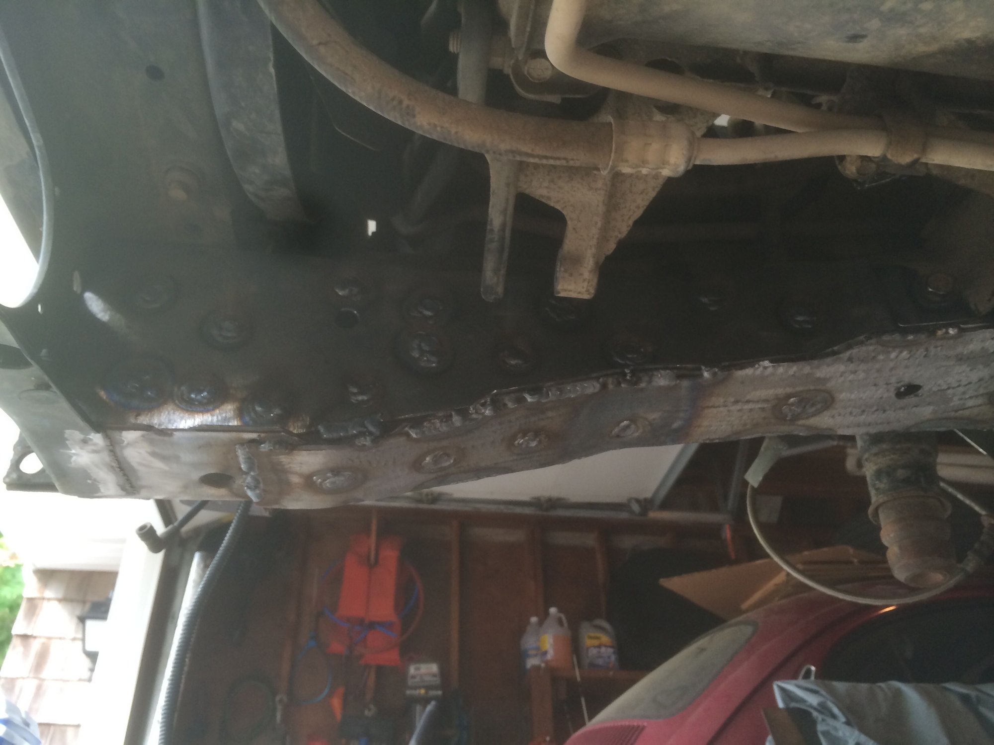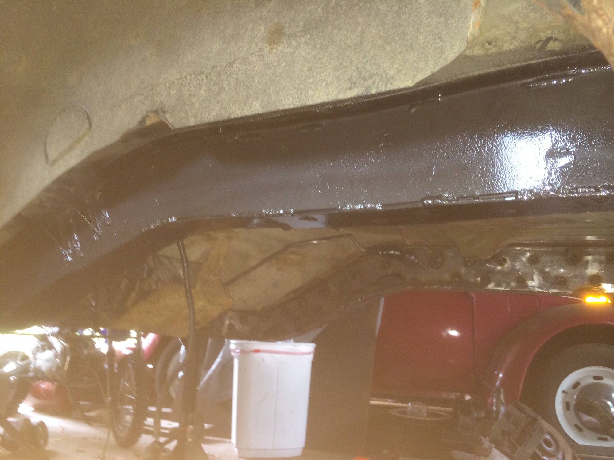 I cut out the old crossmember for the shock mounts, and plated the outside, bottom and inside from the c pillar back. It got painted and the axle underneath.