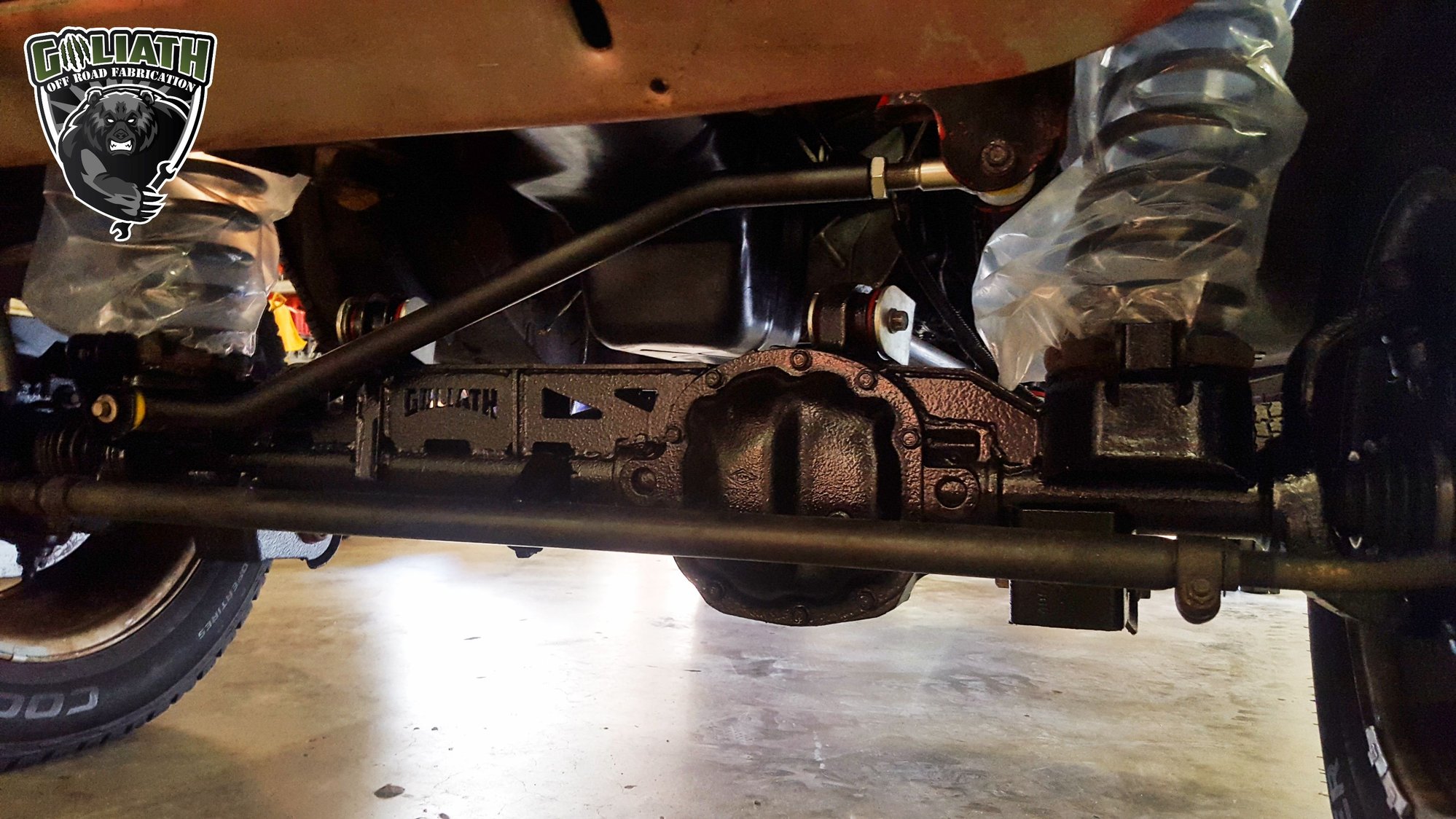 Goliath Off Road adjustable track bar and poly bushings on the front axle are installed. We are waiting for both, front and rear steel diff covers and 1 ton steering.