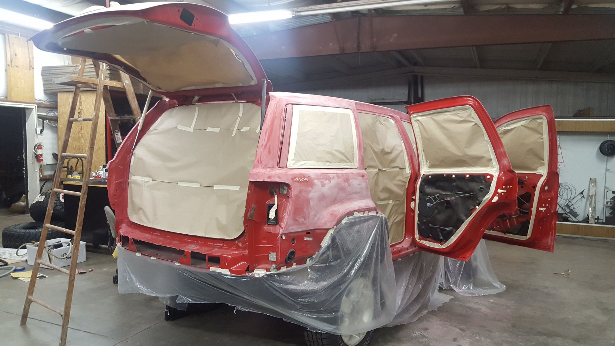 Next step was to paint the Jeep. We painted the whole thing with the kevlar liner, we offer in the shop, tinted red ( original color code from WJ ). I think it came out great!