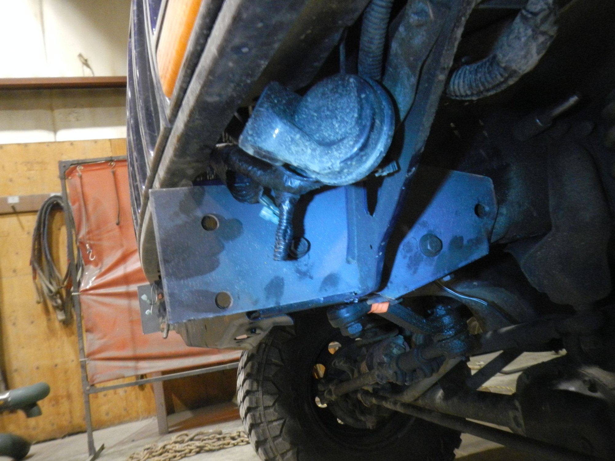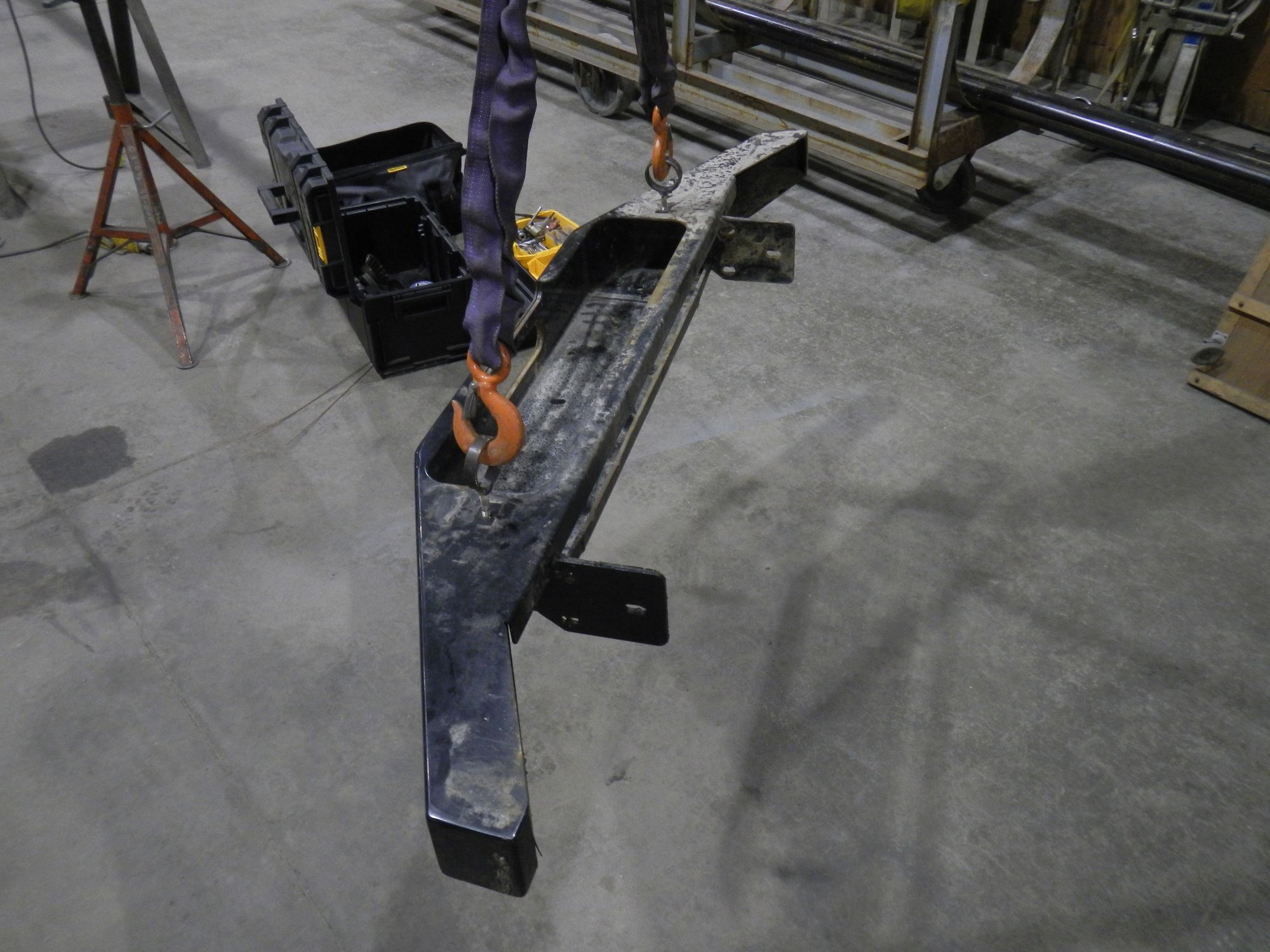 As you can see the bumper only used the stock 6 mounting bolts so the first thing we set about doing was correcting that and yes we did use the 5 ton (or something around there) crane to pull the bumper and move it around. Way overkill yes but fun!
