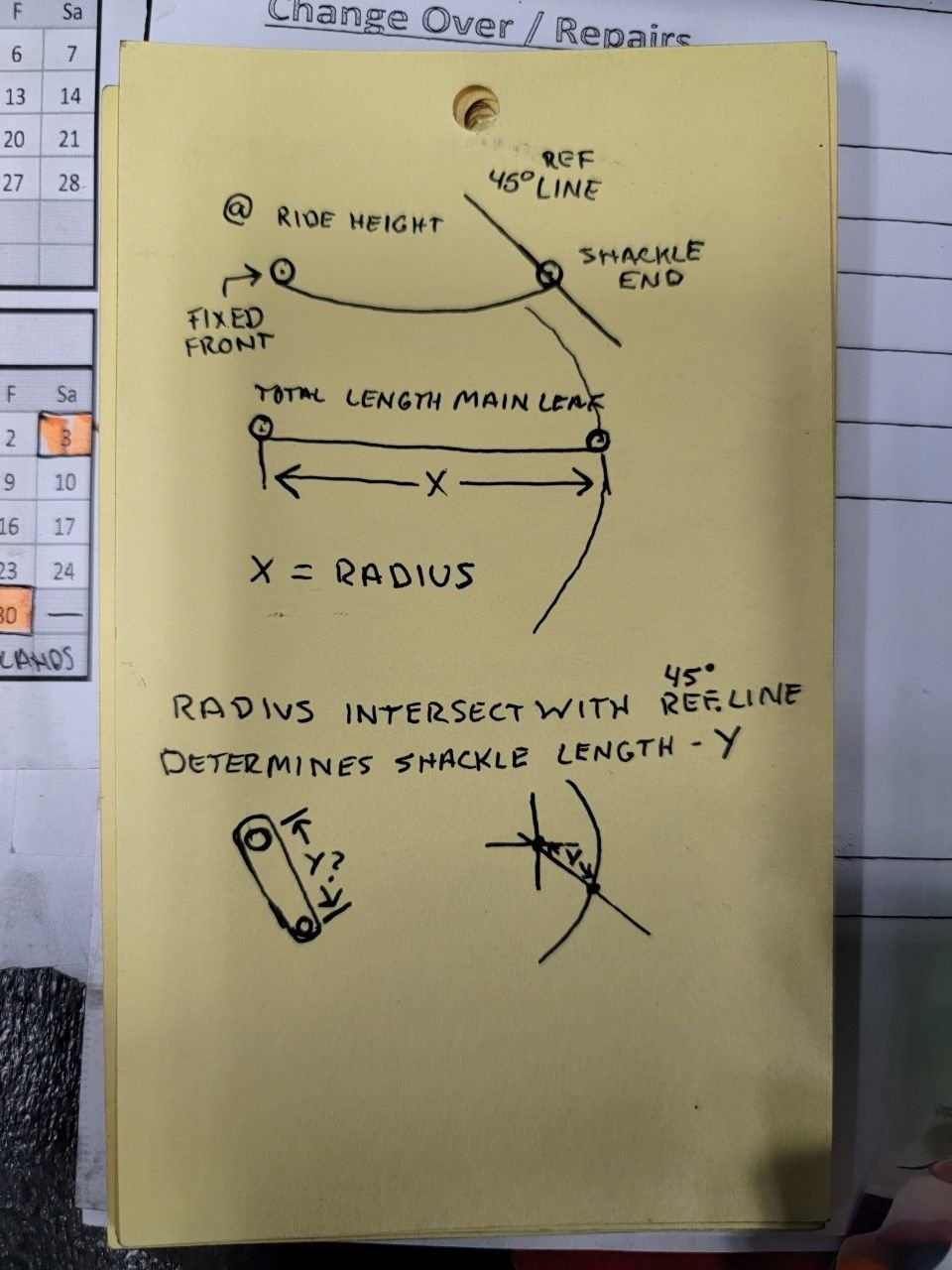 ill be straight forward here.... my doodle for the math behind the shackle layout wasnt working for me... So i settled on just running with the 45* at ride height... shackle length will just be variable on ride level and also leaf spring clearance to the frame.