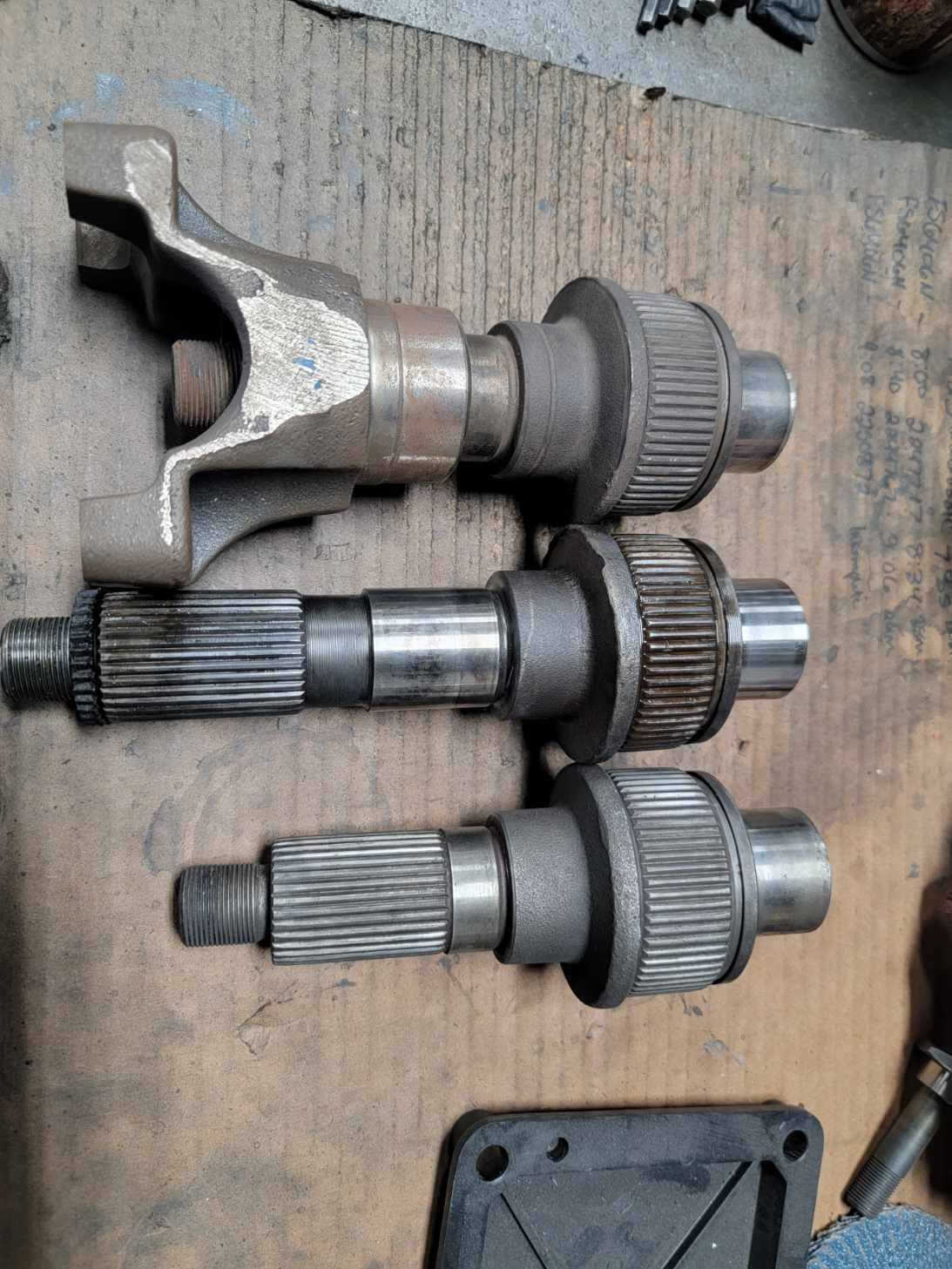 Soo below here are 3 different Front output shafts. The top shaft is a Dodge output shaft for the 1.25" chain - ignore the yoke as I thought it was a 1350 cardan yoke but it turns out its actually some oddball 1330 yoke that im not gonna use. The middle shaft is the chevy output - long sucker! The bottom shaft is the DHD output shaft - kinda hard to tell but its got about 1/8" longer splines on the backside for the bigger sprocket.