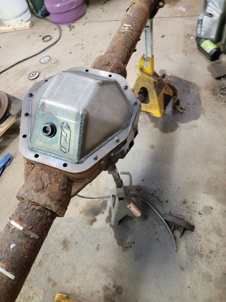 After i called it quits for the night on the tcase i shifted back to the 14b axle. Slipped the hubs off without issue, knocked the old rotors off adn backing plates. Then slapped the new 13Bolt cover from Motobilt on the axle and gathered up some sawzall blades.
