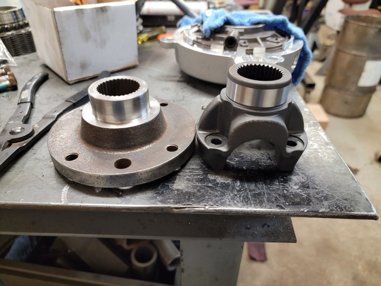 Now for the modified companion flange for the rear output shaft. Original NP205 companion flange on the right and the newly modified companion flange on the left.