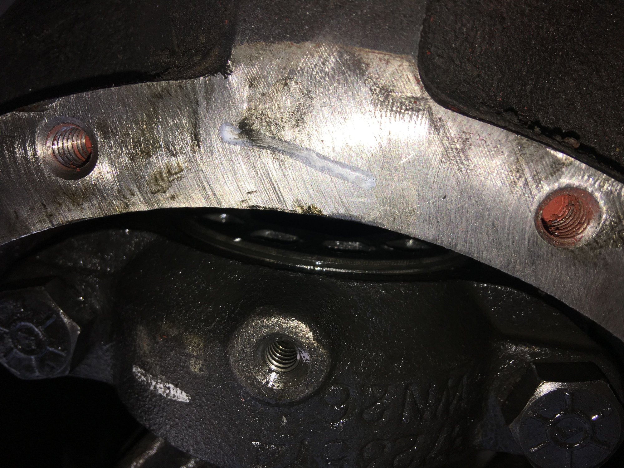 Photo of the new ring and pinion in place. The retainers for the backlash adjusters are not on in this photo.