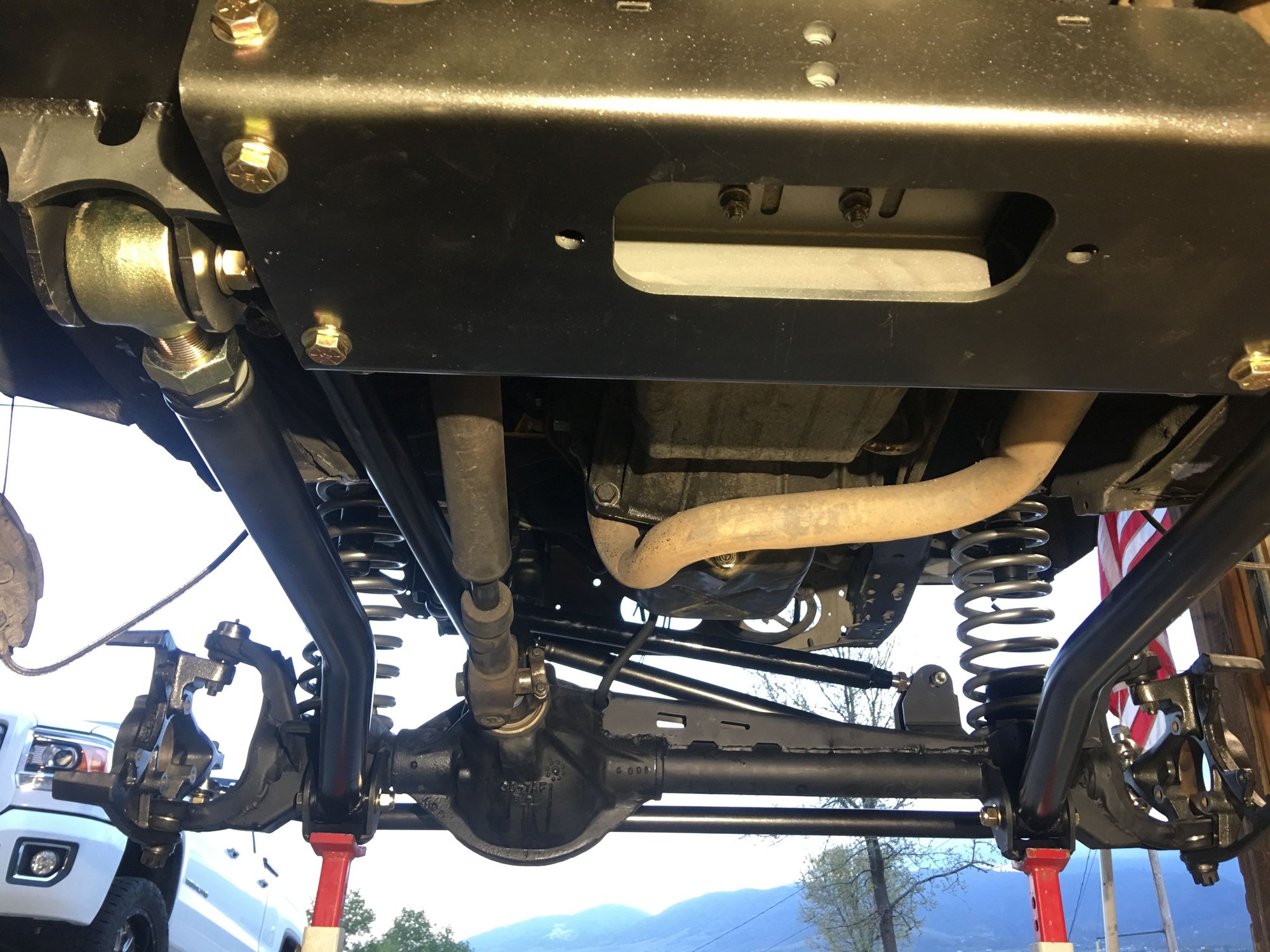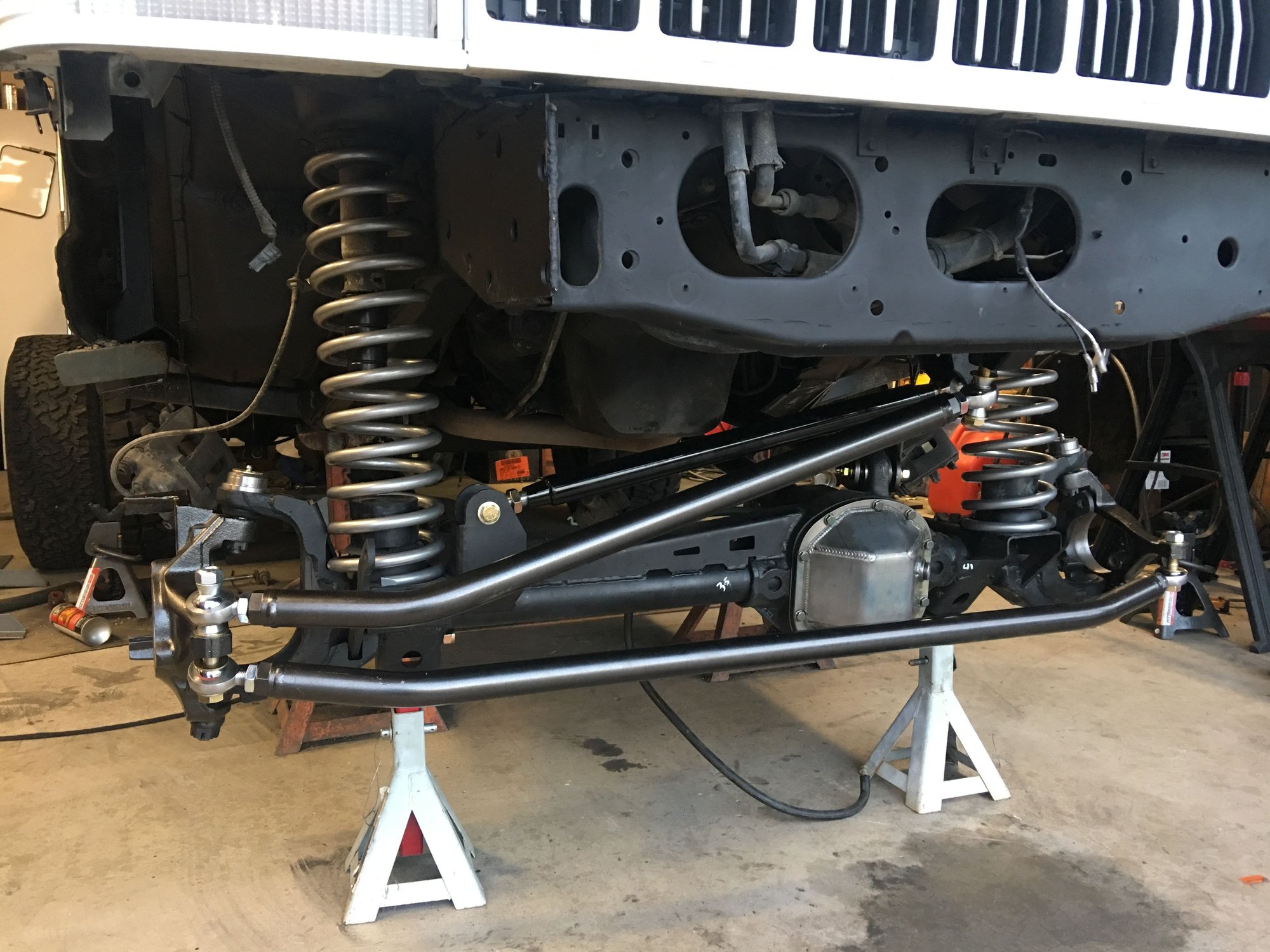 The jeep is back on its own weight. Got the axle in, everything bolted up including the knuckles and steering. I still have to go through and tighten all the bolts fine tune everything, set the pinion angle, etc....... but, there's no more jack stands under the frame.