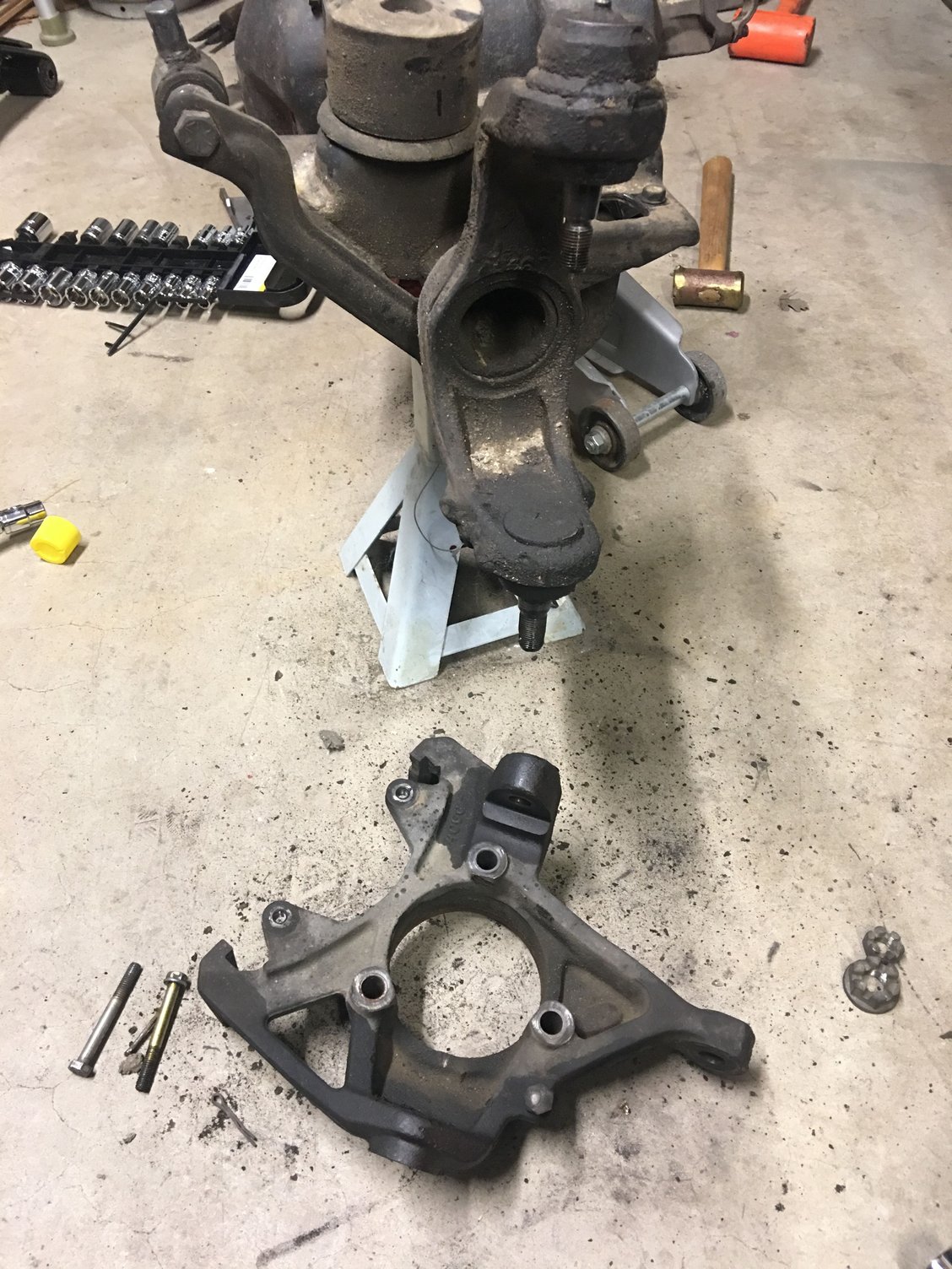 The right side.... not so much. After about 20 smacks with a hammer it barely budged. So I used a pickle fork on it and got the knuckle off, but........ the ball joint came apart and decided to stay stuck in the knuckle.