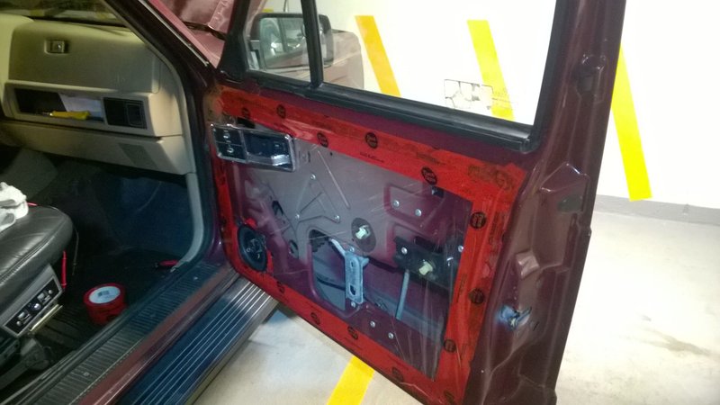 When we swapped the door panels, we also lined the door with plastic and tuck tape to seal it off (to keep the drafts out). The old plastic was just falling off. Not totally necessary but it helped with the sound and temperature a little bit. We also installed speakers.. but more on that in another update.