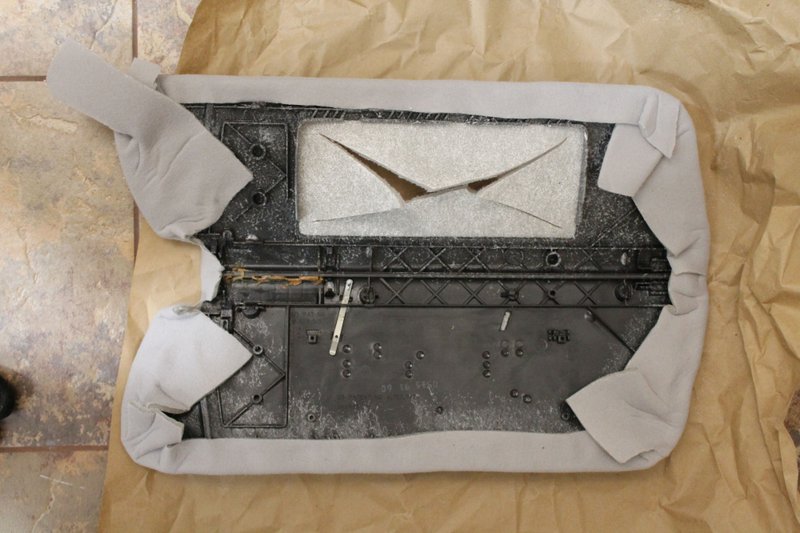 We then upholstered using actual headliner material (foam backed) and several cans of of the Permatex spray adhesive.
