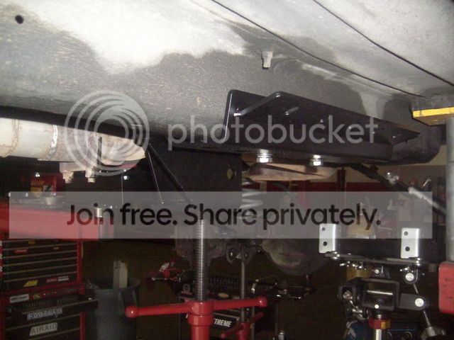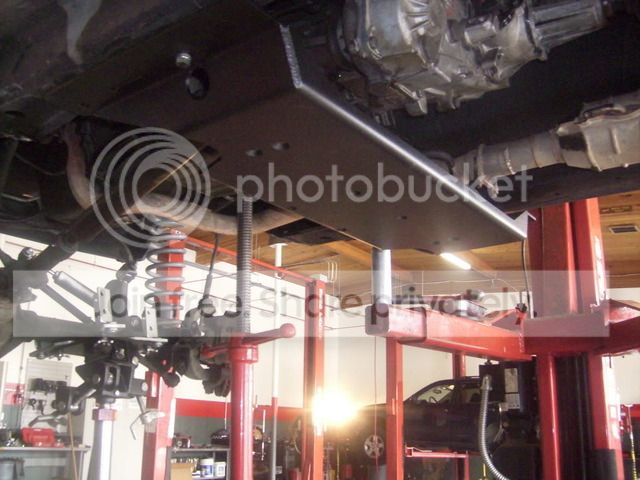 I used another pole jack to hold the tranny and T case up and took off the old cross member, and then I mocked the RE skid and tranny mount up in place.