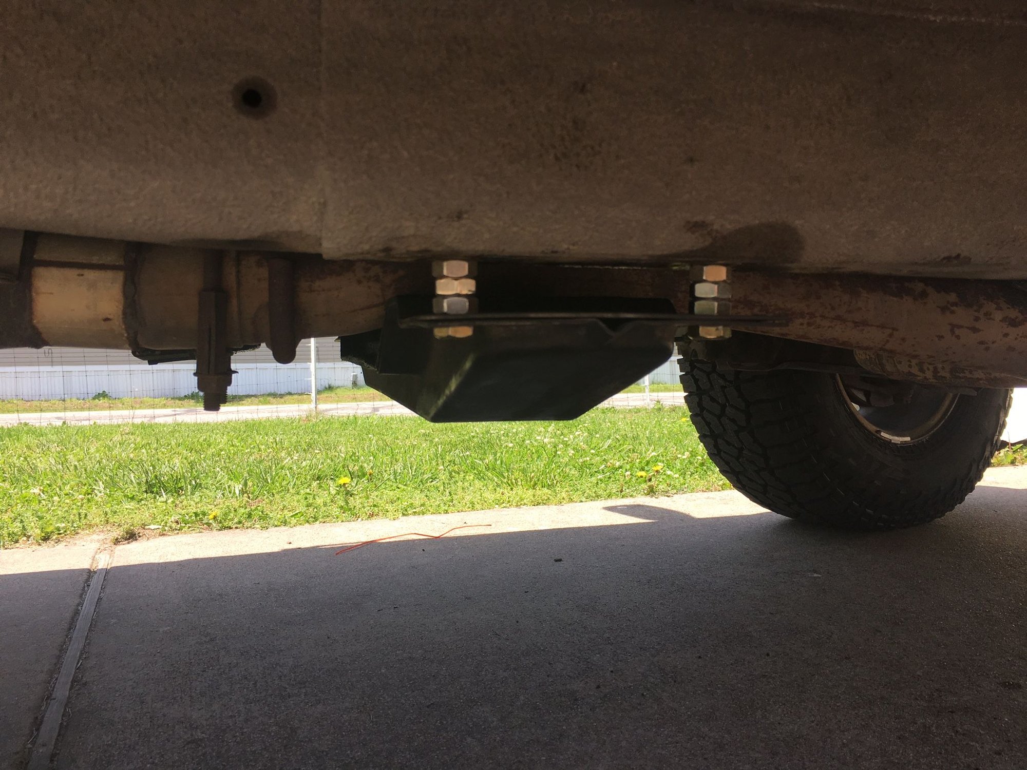 After unbolting the crossmember, I had a little problem with it getting cockeyed and I couldn't get the new bolts in. I solved this by using a tow strap wrapped around the rear axle and the crossmember. Did I tell you about my big brain?