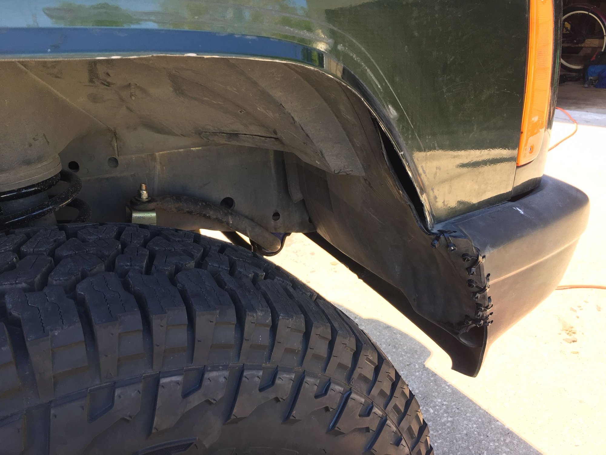 One thing that I did different that most was instead of removing the plastic inner fender cover, I kept it there and zip tied it to the old fender brace bracket thingy to keep it in place. Then I used an old 4-wheeler trick to use zip ties to "stitch" the inner fender to the bumper and thus avoid the problem of having the horn and a few other things exposed to mud and crud.