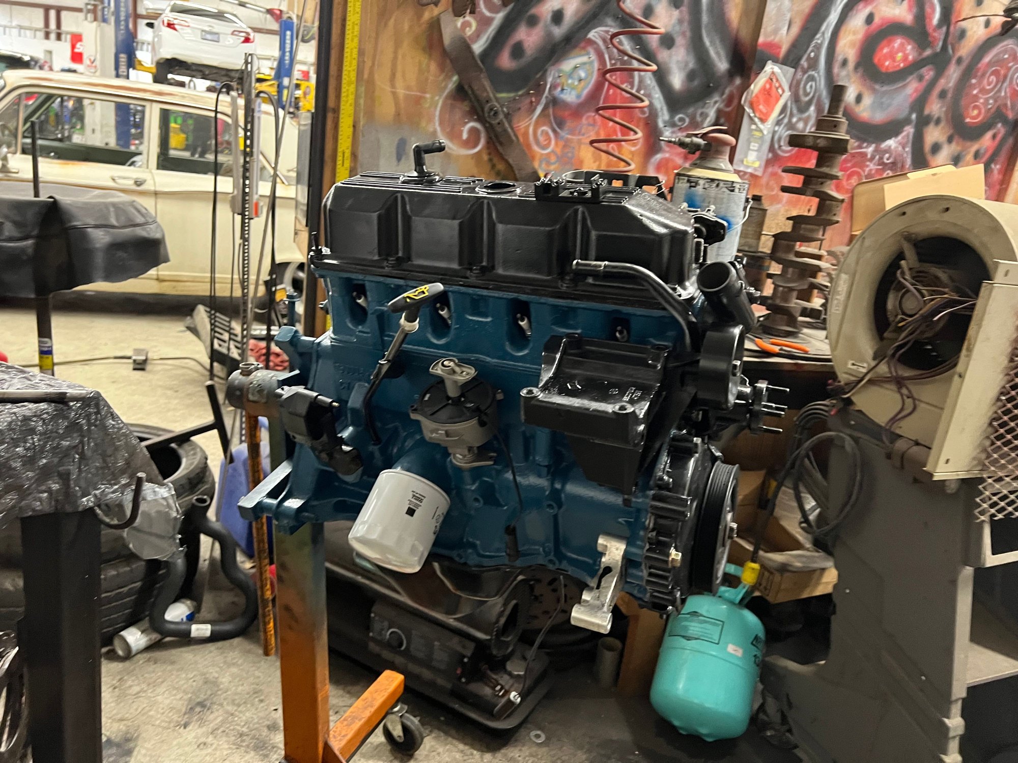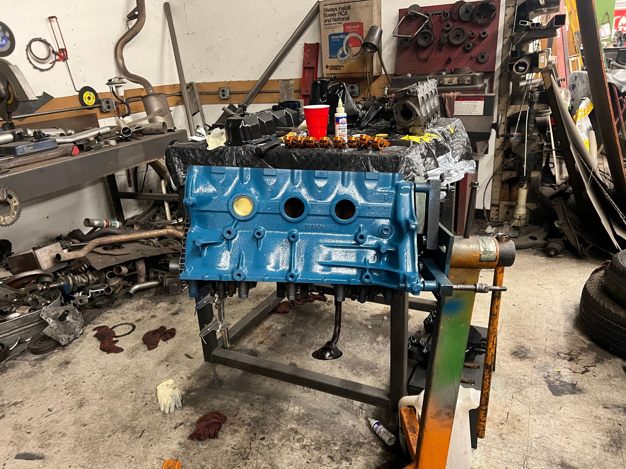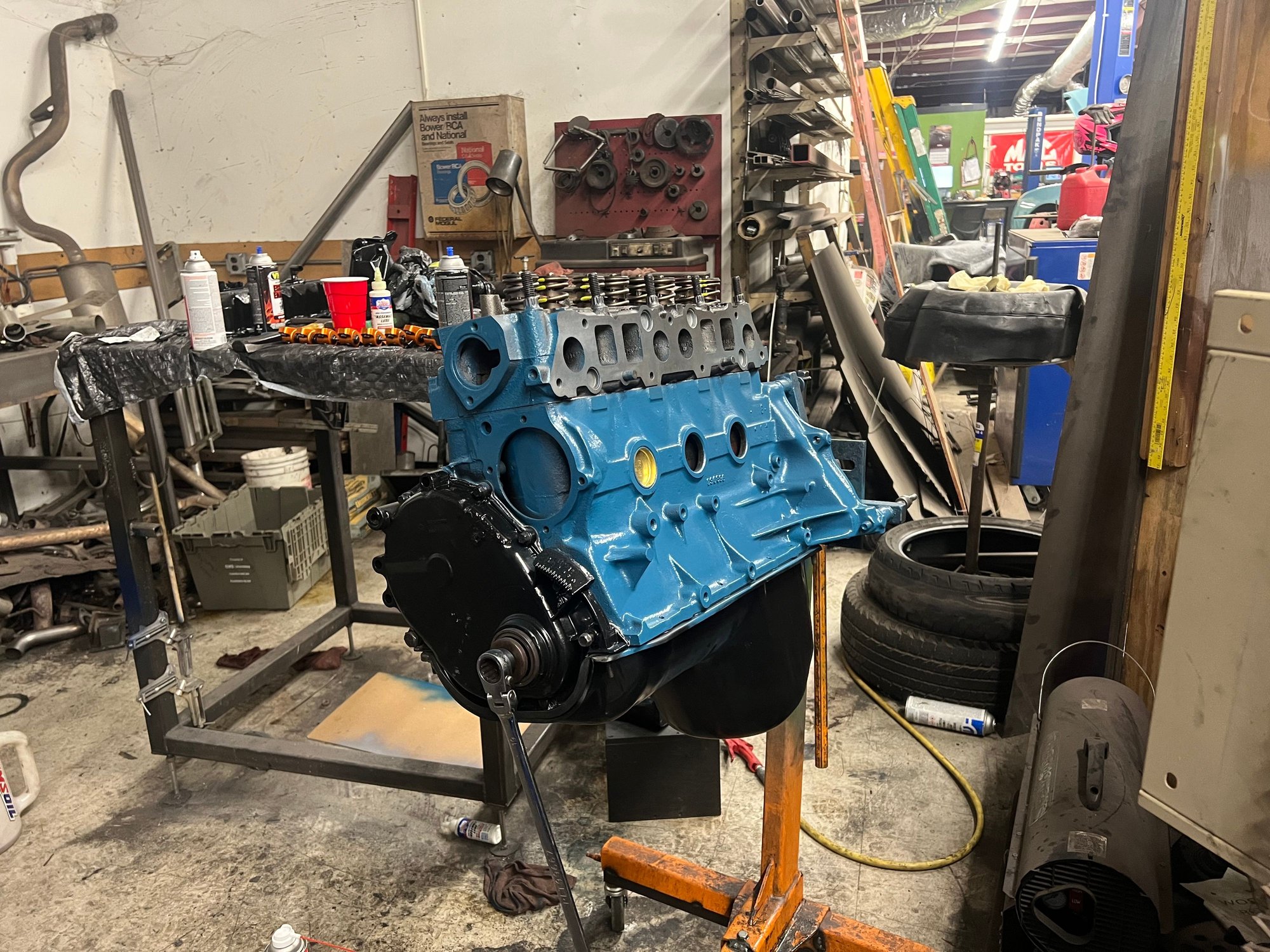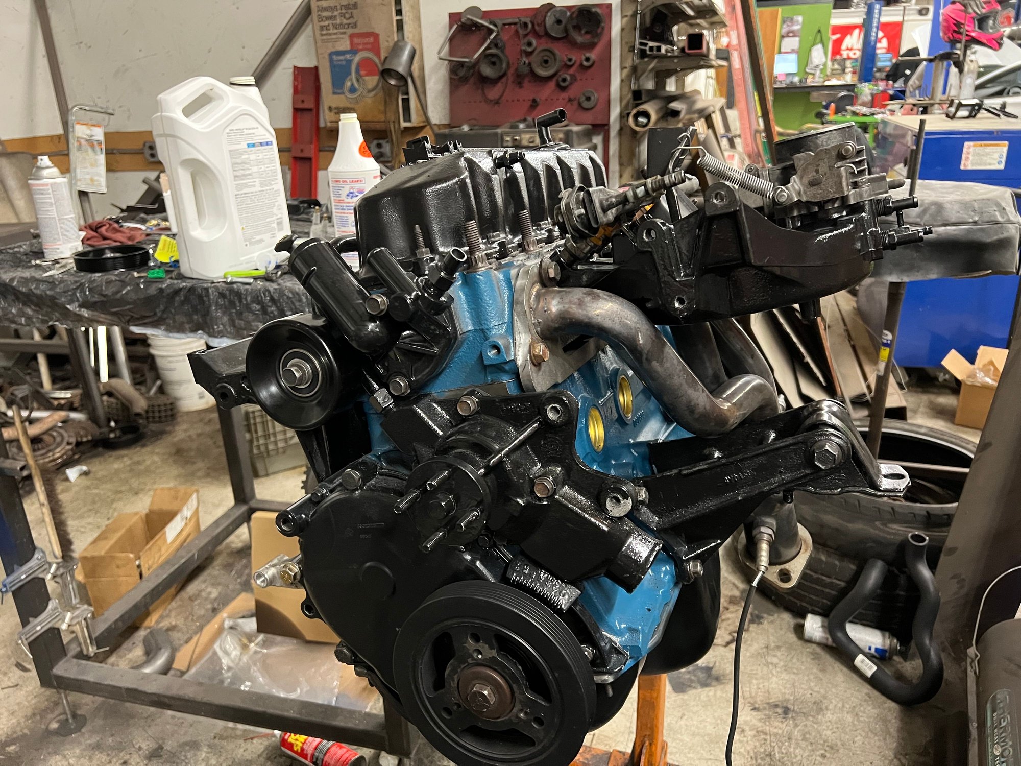 I also got the oil pan, valve cover, timing cover, brackets, intake/exhaust, and mounts bolted up. I just need to install the power steering pump, tensioner, and a few other “loose” items, and she’ll be ready to go back in. Once it’s off the stands, I’ll do the rear main seal and put the flywheel, clutch, and pressure plate on, and drop her in!