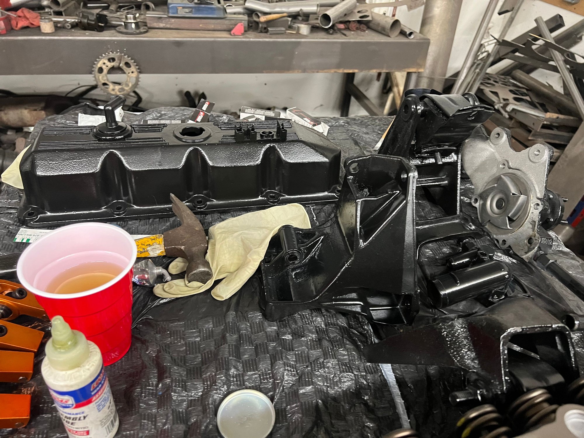 I got a bunch of other brackets spray painted as well as the intake, and I went with black all across the board. I got my lifters installed (with plenty of lube) and I painted my block as well.
