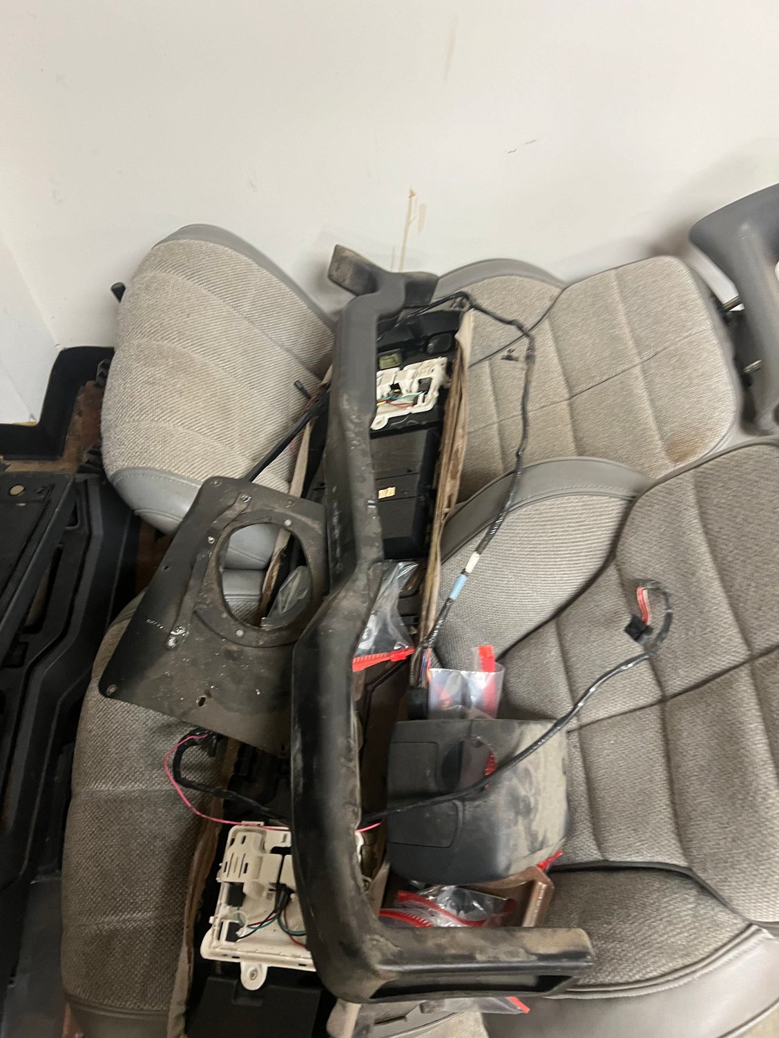 I also got the brackets to adapt the 91 seat to the 94+ design, the kick panel under the dash that I wrecked with my knees when I got rear ended, a new center console that’s not cracked and it’s the color of my interior, a new headliner that’s been re-done, an overhead console that just needs to be recovered, the harness to go along with it, a bunch of brackets to secure the center console, the dash cover, and the clamshell for the steering column. I also bought a new carpet for the passenger compartment, which is a nice black color instead of the outdoor carpet that covers my Jeep.
