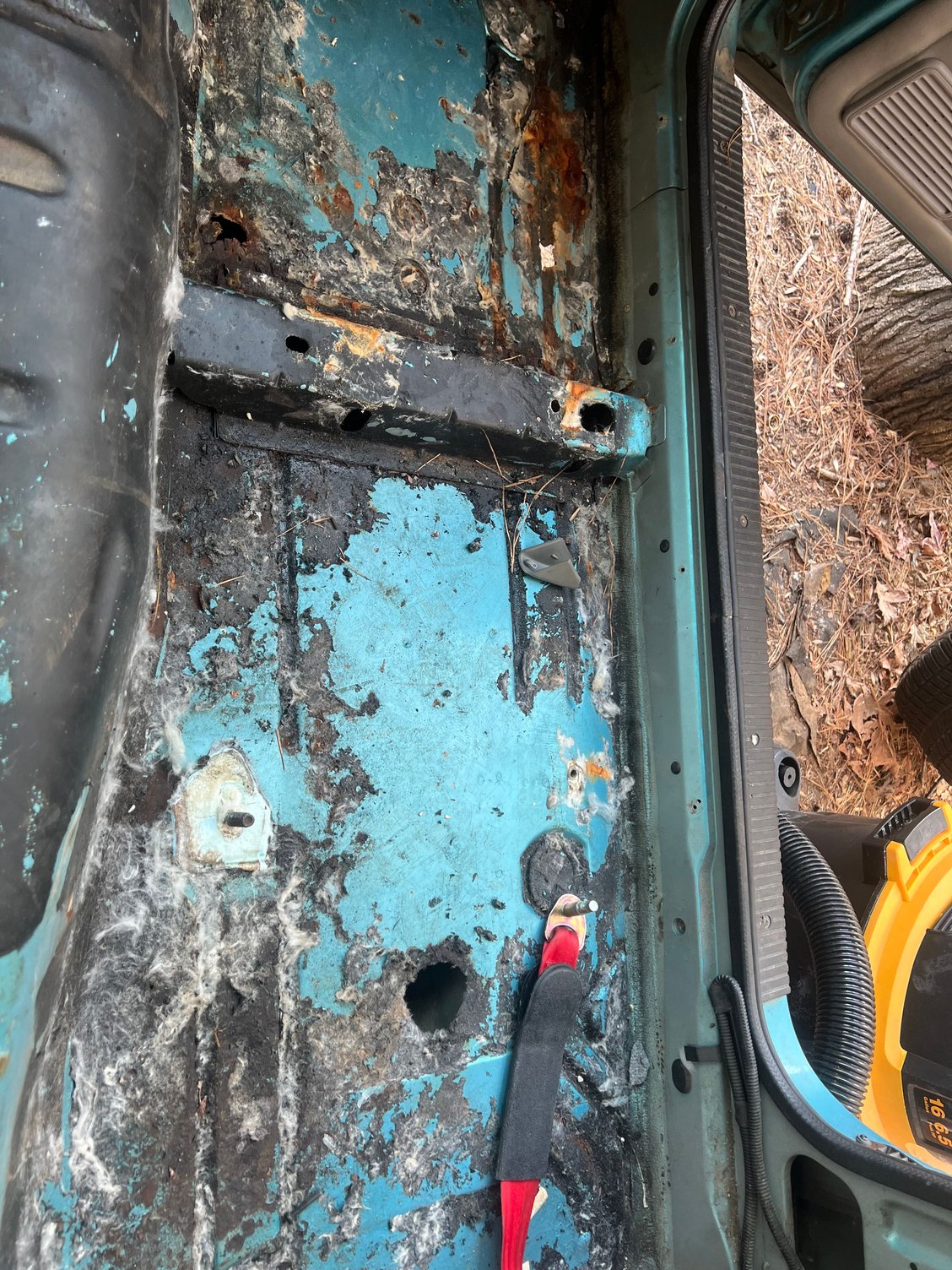 Im also a little torn on how to patch the holes in the floorboard. I want to cut the area around the holes and make a perfect “drop in” cutout of sheet metal and weld it, but my boss said that I would be better off getting body panel adhesive rather than welding it. I’ll have to see what works best, but I know I’m going to be in pretty deep with how much work has to be done to these floor boards.