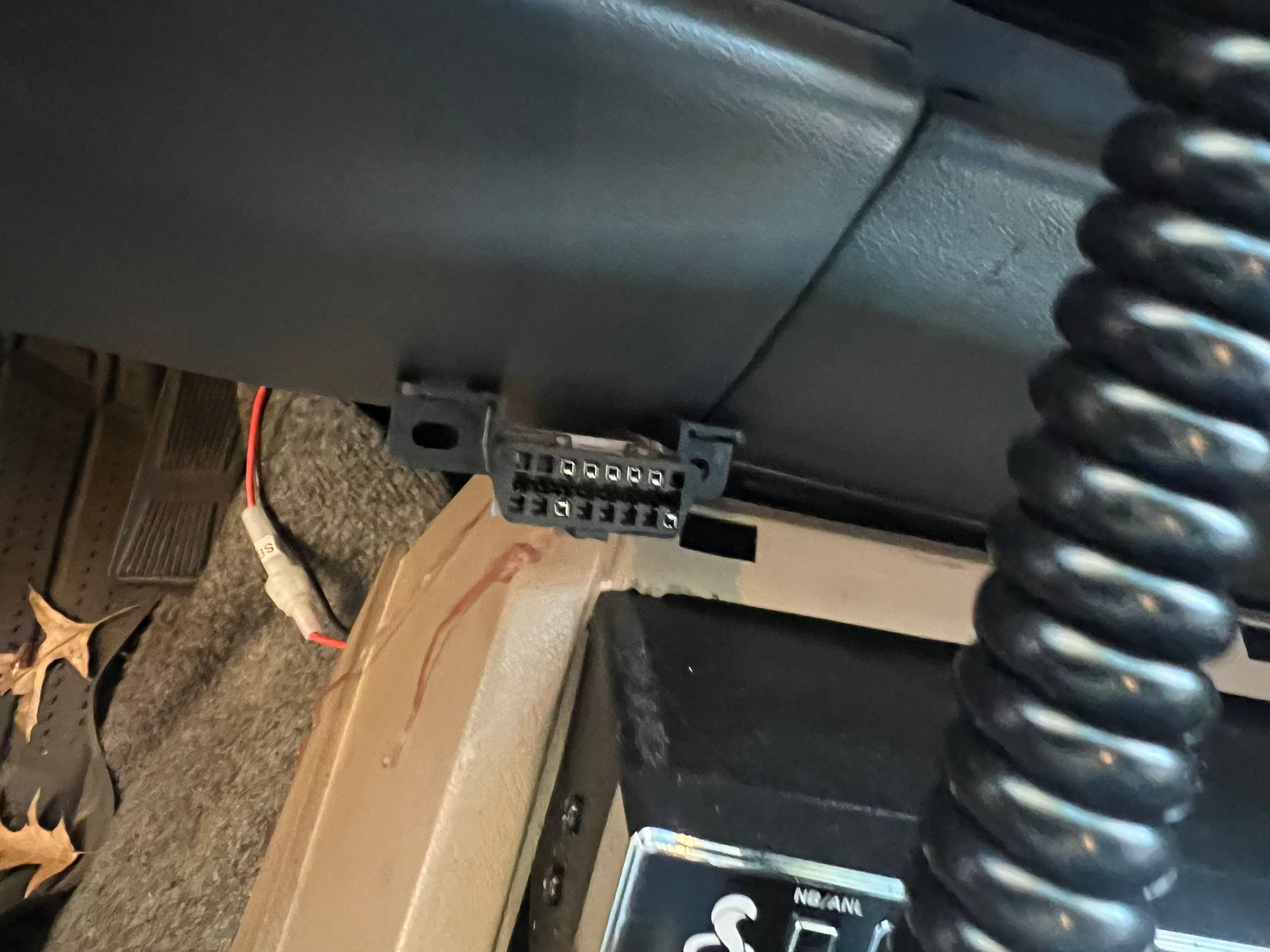 Aside from the “conversion”, I’m thinking about re-locating my CB, again. I’m concerned about the heat it might get from the vents, and it’s so long that it has to be shoved back pretty far to clear the shifter. It would be the perfect setup if I had an auto. But anyway, I want to try and relocate it to the right side of the console, facing me. I don’t care about cutting or drilling this center console because it’s so banged up and broken that I need to replace it anyway. And this way, I can find a place to mount I without having to figure this out on a nicer center console. This is where my port is living for the time being. I want to find a good place for it, and I need to replace that whole kick panel anyway because my knees clobbered it when I got hit. The harness with the new computer, all tucked away nicely.